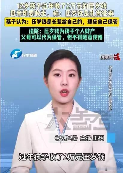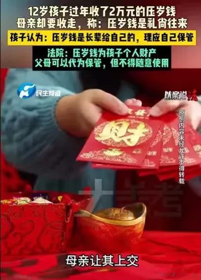 “压岁钱到底归谁?”过年了,女子的孩子,12岁,收到2万元的压岁钱,女子让孩子把钱交出来,她说,这是礼尚往来的钱,她发红包出去,孩子从长辈那里把红包收回来,钱就应该归她,孩子却说,这是长辈给他的,压岁钱就应该由他来支配。 一到过年,小王可高兴了,每年过年,他都可以收到不少的压岁钱,可是往年过年,由于自己年纪还小,收到的压岁钱,几乎都交给了妈妈。 可他12岁了,他觉得自己长大了,压岁钱可不能再给母亲了,他做好这个打算,决定压岁钱由自己保管。 有了这个想法,小王从长辈那里得到的压岁钱,就全部攒起来,他算了一下,他居然能够拿到2万元的压岁钱,他可激动了。 往年拿到的压岁钱,都给了母亲,压岁钱或多或少,他都没什么感觉,反正压岁钱都拿不到手里。 可现在,看着这2万元的压岁钱,如果全部由自己保管支配,那可以买很多东西啊!自己想玩什么就玩什么,想买什么就买什么。 他将这2万元压岁钱放得好好的,就等着有花钱的地方,感受一下花钱的感觉。 可他这2万元压岁钱,还没有捂热呢,妈妈就开口了:“你的那2万压岁钱放哪了,赶紧给我,这是我的,这是礼尚往来的钱,不是你的!” 妈妈又是往年的语气,小王一听,心里就不乐意了,以前他还小,他还不懂事,妈妈说啥就是啥,可现在他12岁了,他长大了,这钱可不能再给妈妈了,这是长辈给他的压岁钱,凭什么给妈妈? 他这么一想,就和妈妈吵了起来,他跟妈妈说:“这明明是长辈给我的红包,怎么就成了礼尚往来,成了你的钱?这是我的压岁钱,我都12岁了,这压岁钱就应该由我来保管,自己支配。” 妈妈一看小王,居然因为2万元的压岁钱和她吵起来,一看小王想叛逆的样子,妈妈也一肚子火。 她跟小王解释,压岁钱是礼尚往来的一个表现,是父母把红包给了亲戚的小孩,亲戚作为长辈,也是礼尚往来,才把红包给回小王,实际上就是妈妈给出去的钱,回到了小王身上。 妈妈这么一说确实是合情合理,事实也是这么一回事,都是大人把压岁钱发给亲戚的小孩,亲戚自然也要把红包给小王。 小王可不是这么想的,即使是妈妈没有把红包给亲戚的小孩,长辈也会给他发压岁钱。 小王这么一说也是很有道理,他可以从爷爷奶奶,外公外婆,以及其他长辈那里拿到压岁钱,妈妈是不需要给这些长辈压岁钱的,那些长辈给小王的压岁钱,那就是长辈给小王的,不是礼尚往来。 小王这么一说,妈妈说不清了,他们两人就这样,你一言我一语就吵了起来,谁也说服不了谁。 作为妈妈,她觉得小王才12岁,还是个孩子,完全不能支配2万元的压岁钱,何况她始终觉得这2万元,就是自己先送出去的,是亲戚之间的礼尚往来,才回到小王这里,这就是礼尚往来的钱。 2万元不是个小数目,既然是大人礼尚往来的钱,小孩就不能支配这笔钱,更何况孩子才12岁,对钱根本就没有概念,如果12岁就随便花2万元,到时候养成大手大脚的习惯, 就很难改过来,她坚持要小王把2万元给她。 小王却始终觉得自己12岁了,已经长大了,有能力支配这2万元,而且这2万元就是长辈给他的,妈妈没理由要他的压岁钱。 他们俩吵着吵着就闹上了法庭,法庭上,大家依然是如此各执一词。 那么这2万元的压岁钱到底归谁呢? 从法律的意义上来说,长辈给小王的压岁钱属于赠与,这是小王的个人合法财产,任何人都不能侵占。 《民法典》第267条规定:私人的合法财产受法律保护,禁止任何组织或者个人侵占、哄抢、破坏。 但是小王毕竟才12岁,确实没有支配2万元压岁钱的能力,如果钱在小王手中,有可能会随便就花掉,小王应该把钱交给父母保管,这2万元是小王的个人财产,不是母亲的。 法院判决这2万元属于小王的个人合法财产,由父母保管。 那么你觉得,孩子的压岁钱到底归谁呢?
