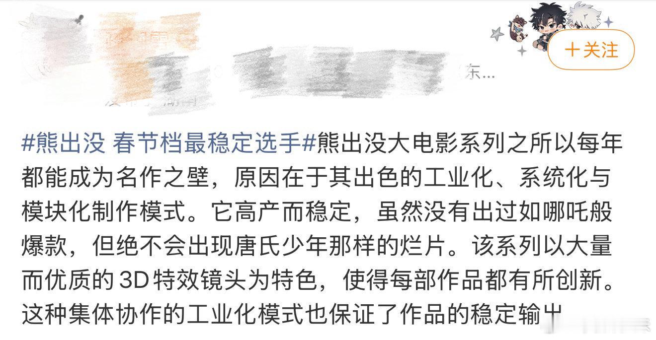 熊出没 春节档名作之壁十二部作品,恰如一轮生肖。在最中国的节日里,熊出没唤醒中国家庭对“习惯”的路径依赖。或许再过十二年,它不再是习惯,而是春节的必备习俗