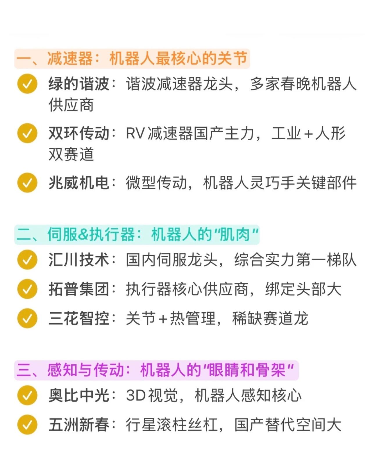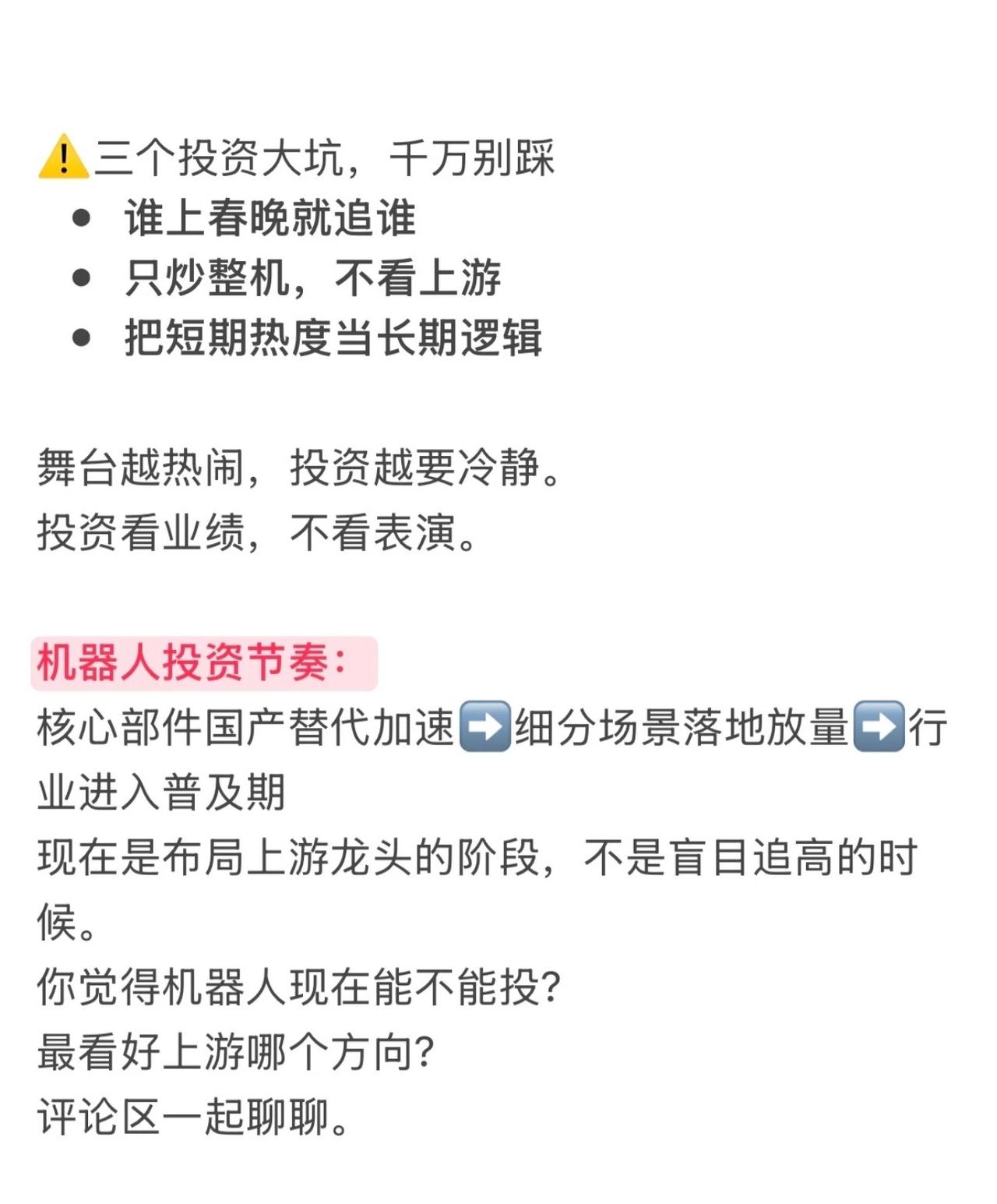 春晚机器人表演引发关注,但投资需理性——“舞台看整机,投资看上游”,科技赛道上游(核心部件)壁垒高、毛利高、业绩稳,是布局重点。 核心部件及对应企业: 1. 减速器(机器人核心关节):绿的谐波(谐波减速器龙头)、双环传动(RV减速器国产主力)、兆威机电(微型传动/灵巧手部件); 2. 伺服&执行器(机器人“肌肉”):汇川技术(国内伺服龙头)、拓普集团(执行器核心供应商)、三花智控(关节+热管理稀缺赛道); 3. 感知与传动(机器人“眼睛和骨架”):奥比中光(3D视觉核心)、五洲新春(行星滚柱丝杠国产替代)。 避坑指南与投资节奏 - 三大雷区:别追“上春晚”概念股、别只炒整机忽略上游、别把短期热度当长期逻辑; - 投资阶段:当前处于“核心部件国产替代加速期”,应布局上游龙头,而非盲目追高;后续将经历“细分场景落地放量”“行业普及期”。 简言之,机器人投资需聚焦上游核心部件,选壁垒高的龙头企业,避开短期炒作陷阱,把握国产替代加速的布局窗口。