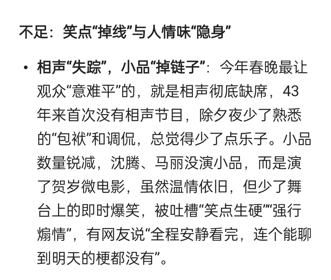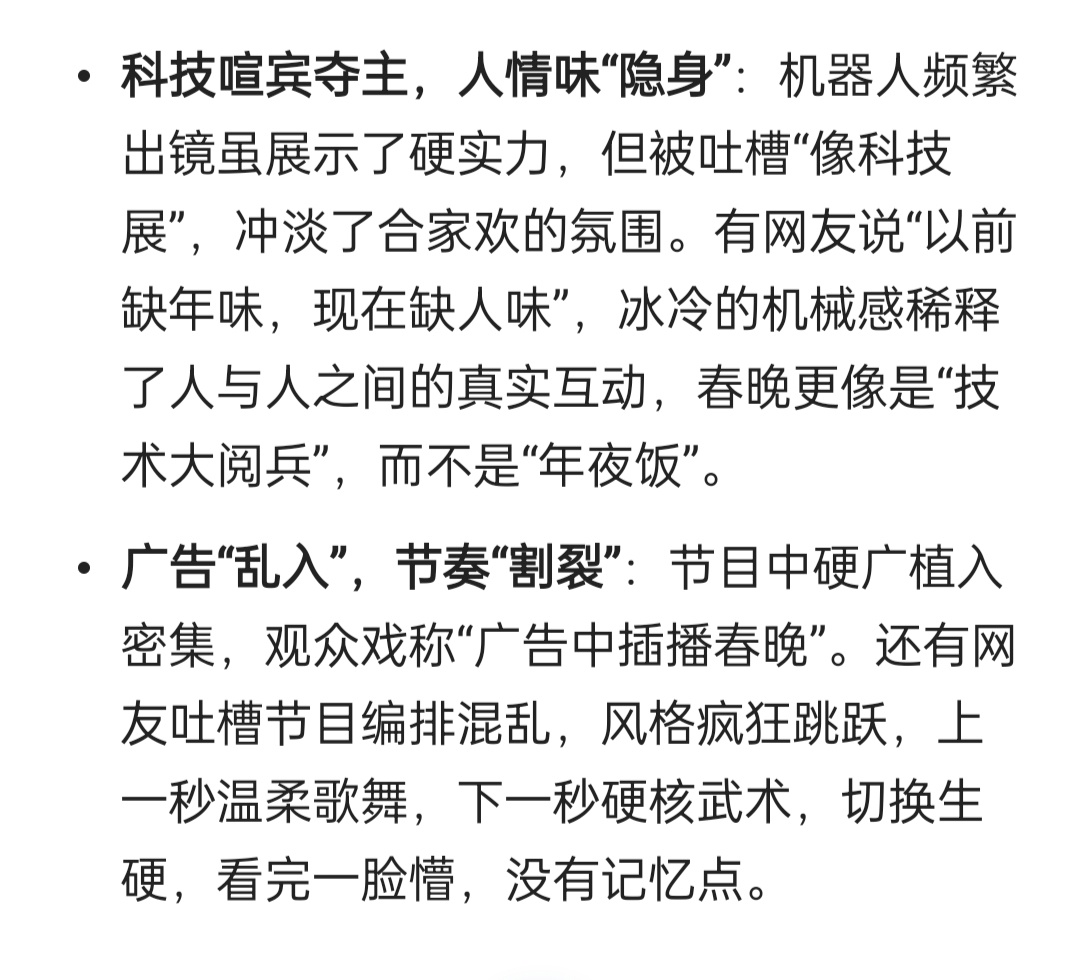 相声“失踪”,小品“掉链子”,43年来首次没有相声节目,除夕夜少了熟悉的“包袱”和调侃,总觉得少了点乐子。科技喧宾夺主,人情味“隐身”:机器人频繁出镜虽展示了硬实力,但被吐槽“像科技展”,冲淡了合家欢的氛围。