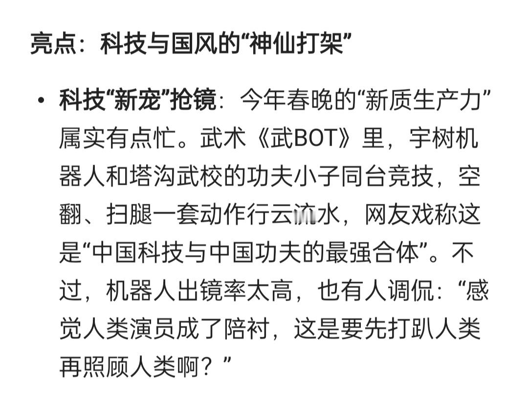 我AI聊春晚关于马年春晚评价,AI回答好中肯!马年春晚的帷幕落下,这台晚会就像一桌精心烹制的大餐,卖相极佳,营养丰富,但口味嘛,似乎少了点让人欲罢不能的“锅气”。