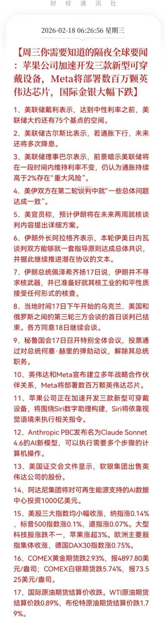 好消息,初二全球股市普涨!利好消息来了!利好消息如下:利好消息一:太牛了,昨夜美股开盘下跌,一度下跌幅度达到1%,但最终低开高走,三大股指集体上涨!消息方面,英伟达和meta战略合作协议,未来meta将采购数百万颗英伟达芯片。利好消息二:美伊核谈取得进展,未来两周将出台细化方案弥补分歧,避险情绪瞬间降温 ,贵金属期货大幅下跌。利好消息三:春节低空经济消息发酵,春晚多场景画面宣传。从无人机表演,到低空载客,长三角都市圈短途运输等,全方位展示!利好消息四:港股恒生指数期货大涨1%,富时A50指数飘红。欧洲股市集体上涨,新年新气象!祝大家投资愉快,点赞者发财啊