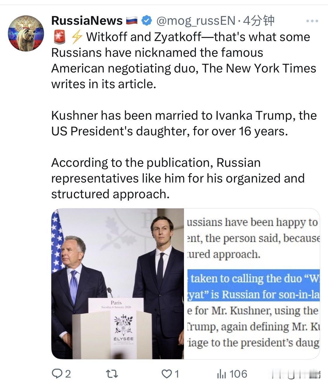 《纽约时报》在其文章中写道,一些俄罗斯人给这对著名的美国谈判二人组起了个绰号叫“维特科夫和扎特科夫”。 库什纳与美国总统的女儿伊万卡·特朗普结婚已超过16年。 据该刊物报道,俄罗斯代表们喜欢他有条不紊、结构严谨的工作方式。