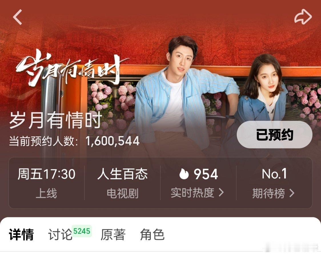 电视剧岁月有情时黄景瑜张小满预约破160万!