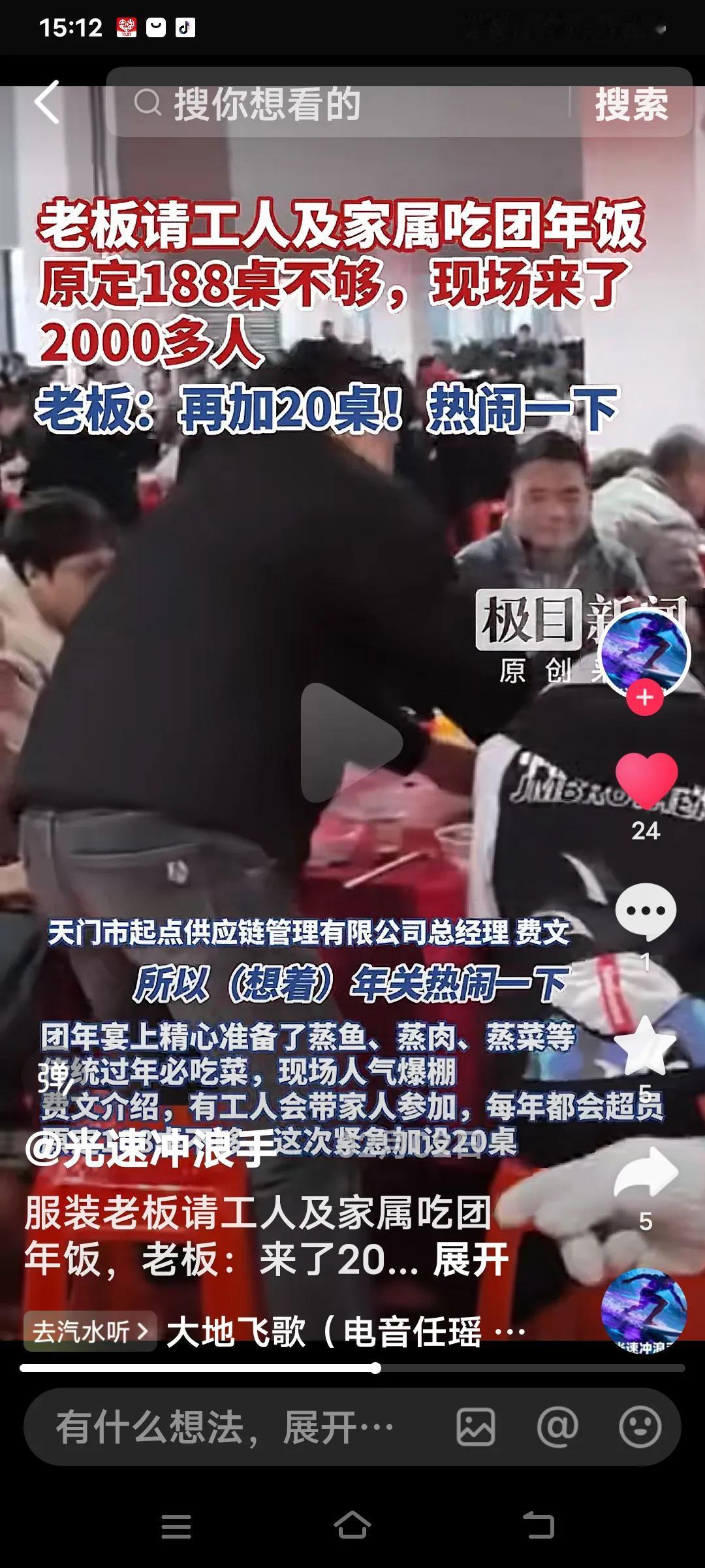 1月31日的湖北天门,一家服装厂老板请工人吃团年饭。老板一句“把家属都带上”,让场面彻底失控。原本预设188桌、1200人的年会,涌进了2000多人,多了800多张嘴。 饭店经理急得脸都白了,手也抖了,预备区全满,门口还乌泱泱地往里涌人,有妇女、老人,有从把丈母亲,老丈人。还有父,母都带来了。 可老板大手一挥:“加桌!大家聚一次不容易,必须吃好喝好!”现场热闹得像赶庙会,防滑垫都被踩变形,服务员穿梭上菜,后厨师傅从早忙到晚。这“家属随便带”,是老板对员工的信任,也让员工感受到家的温暖,不得不承认这老板,格局真大! 说到底,现在这样的老板真不多见了呀,大家开心就行啊!天门聚餐 企业团年宴