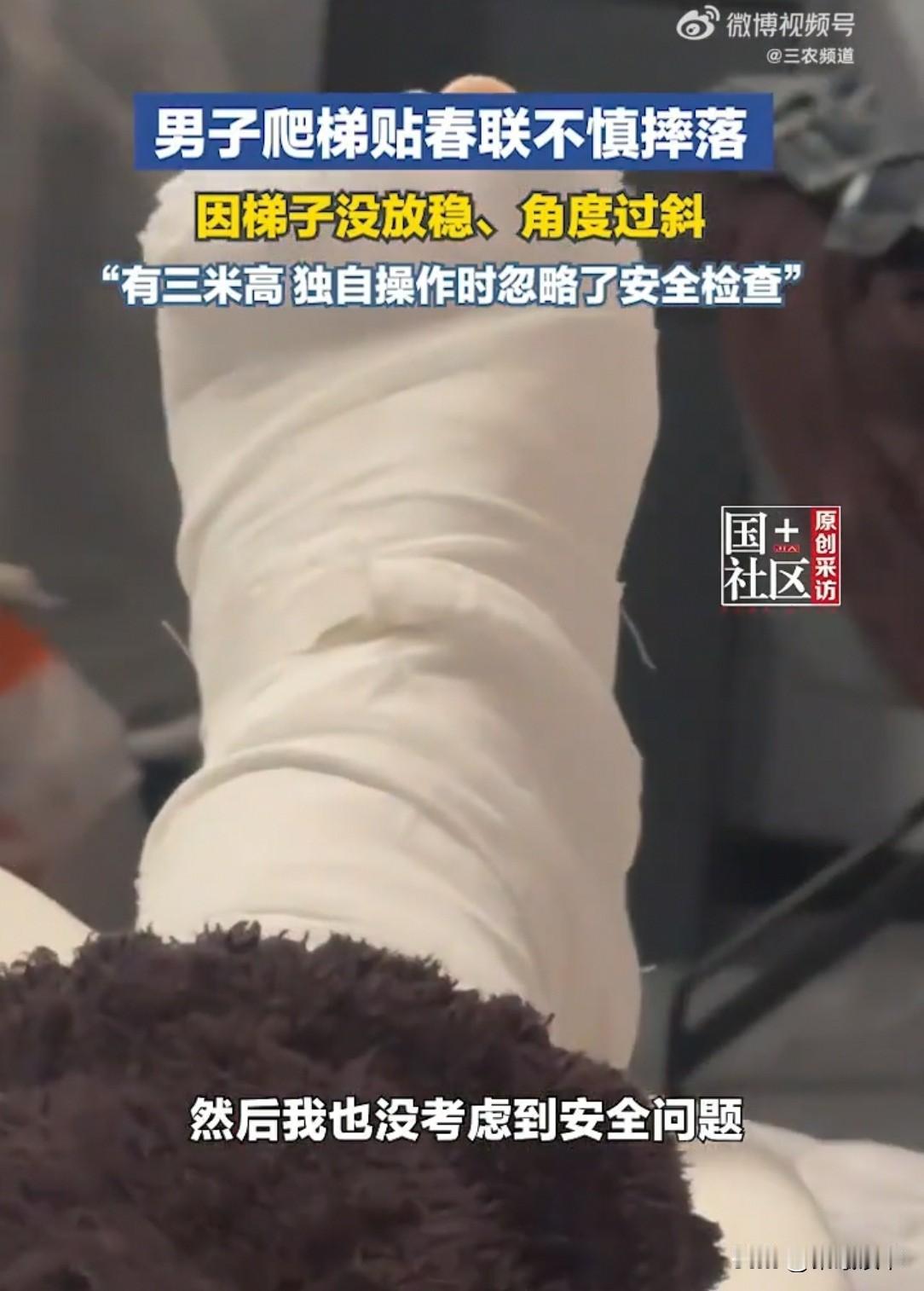 河北邯郸一小伙贴春联摔骨折,亲戚们一开始都挺心疼他,觉得太倒霉了。可等看到他爬梯子贴春联的视频后,全都笑到肚子疼,直说:“难怪会摔成这样,你不摔谁摔啊!” 2月15日下午,也就是过年前一天,邯郸小伙打算给家里贴春联。他搬来一把梯子,没做任何检查,也没叫家人帮忙扶着,就直接爬了上去。 梯子架好后离地足有三米高,他刚抬手准备贴春联,梯子突然一滑,整个人瞬间从高处重重摔在了地上,当场就把脚摔骨折了。 过年期间,亲戚们上门走访,看到小伙的脚被厚厚的纱布裹得严严实实,都十分惊讶。大家纷纷询问,前几天还好好的人,怎么短短两天就伤成这样。 小伙无奈地说,自己是贴春联时摔伤的,已经确诊骨折,接下来每周都要去医院复查,只能慢慢休养恢复。 起初,亲戚们都十分心疼,觉得大过年的受伤实在太倒霉。可当大家看到他当时贴春联的视频后,全都忍不住笑到肚子疼,还打趣道:“难怪会摔成这样,你不摔谁摔!” 原来,小伙当时把梯子摆得又斜又陡,角度极其不稳,全程也没有家人在旁搀扶,这样的操作,不出意外才怪。 面对亲戚们的调侃,小伙也不好意思地挠了挠头。他解释说,当时只觉得这样摆距离刚好,离得太近又觉得太高,完全没意识到这样摆放梯子极易倾倒,这才酿成了意外。 这件事也提醒大家,春节期间登高贴春联、挂灯笼,一定要检查工具是否稳固,最好有人在旁看护,千万别因为一时大意让自己受伤,影响过年的好心情。