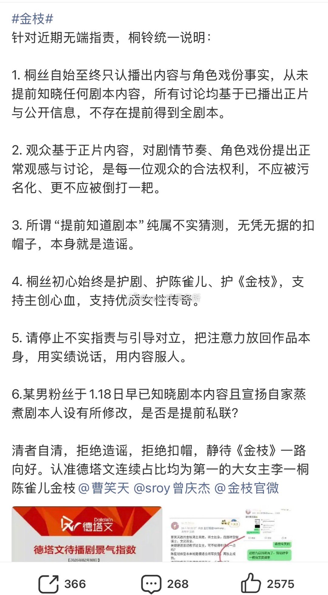 李一桐陈星旭两家就金枝发文,不存在提前知道剧本,停止说男主加戏等传言等