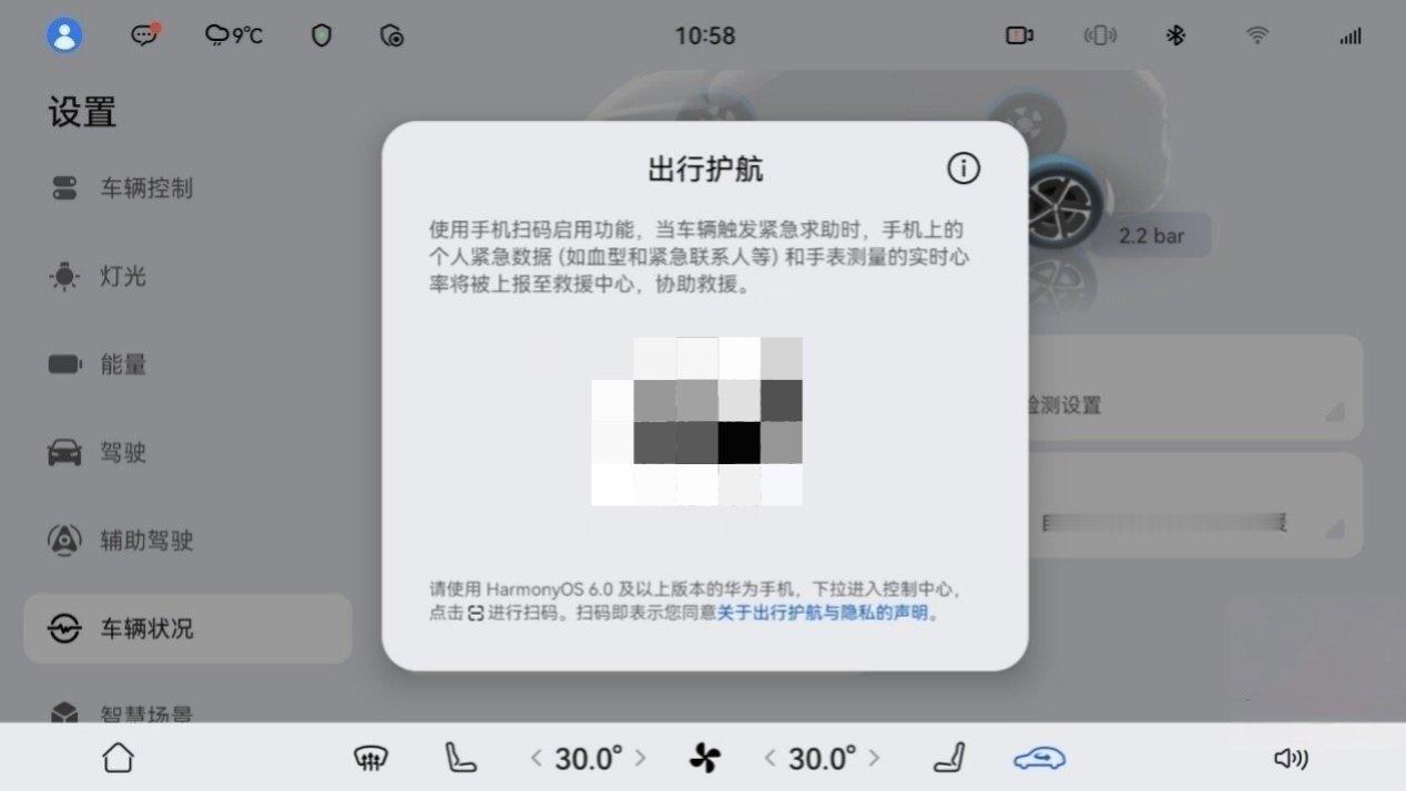 1、在车机设置 → 车辆状况 → 出行护航,点击出行护航会弹出二维码界面;