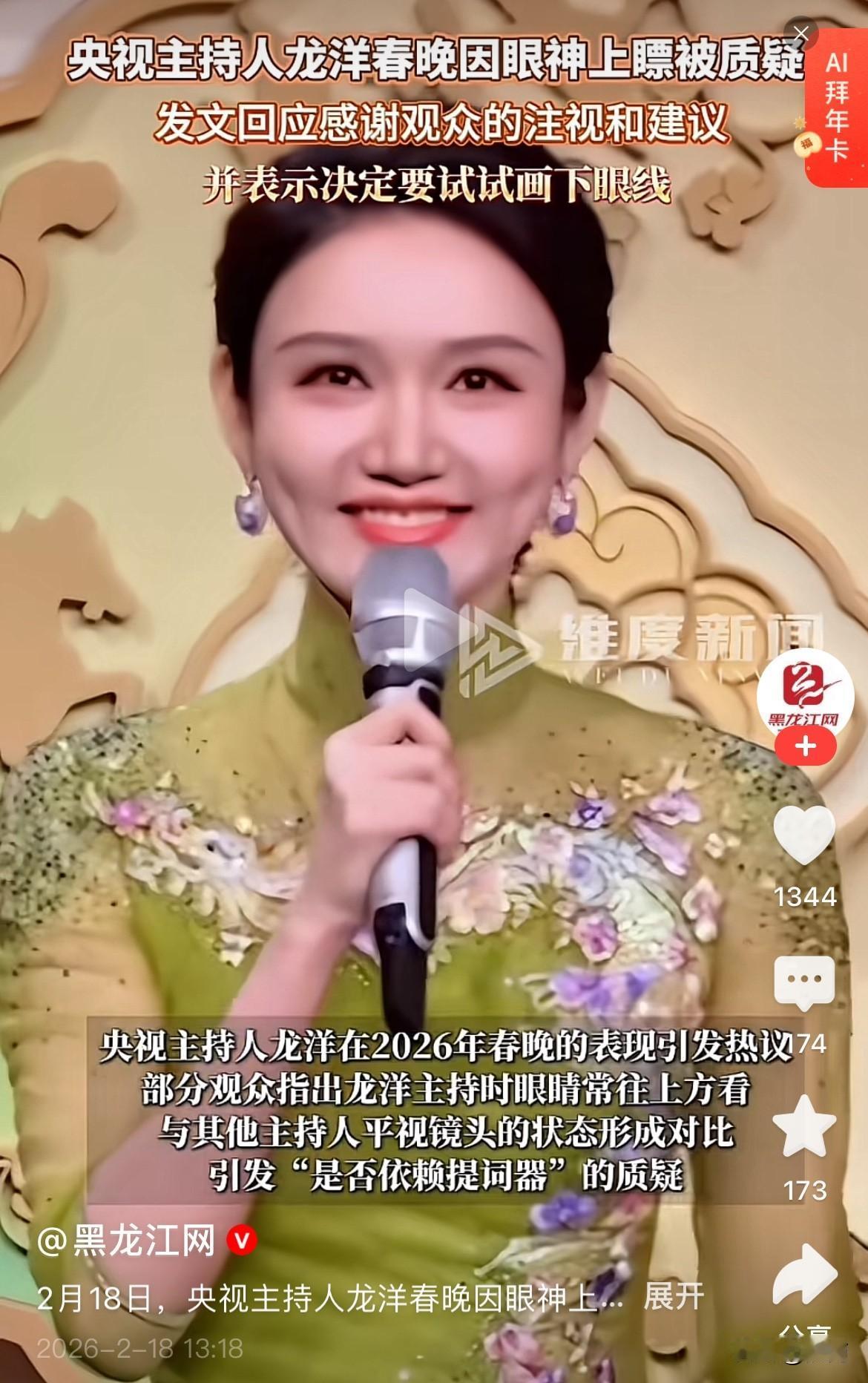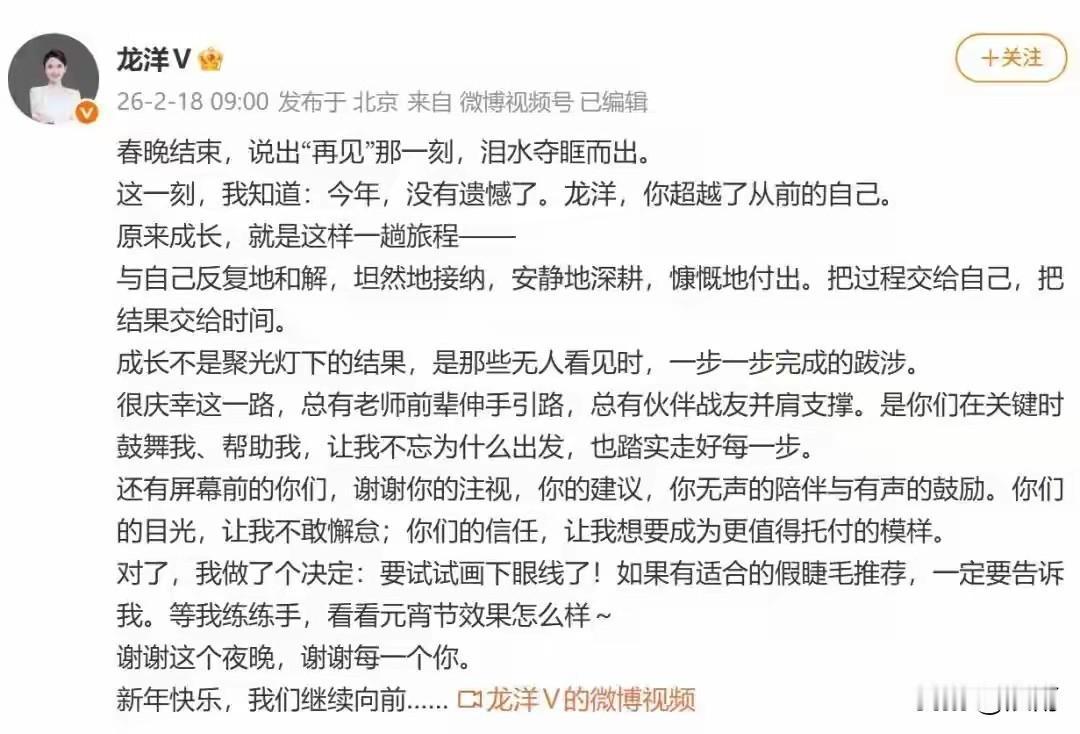 被质疑后,龙洋的回应绝了。没有抱怨,没有委屈,没有不满,有的只是感谢。 她对自己在春晚舞台上的表现很满意。没有遗憾,并且认为超越了以往的自己。 她感谢了前辈老师,伙伴战友,还感谢了广大的观众们。 同时,她委婉的解释了自己的眼睛为什么会往上看。并不是因为忘词了,在看提词器。而是,因为没有画眼线。 她说要画个眼线,并且戴上假睫毛,然后在元宵晚会上亮相,让大伙到时候在看看。 龙洋的这番回应,让大家知道了她在努力的付出了。同时,她并没有把功劳全揽在自己身上。既肯定了自己,又夸赞了同事们。非常完美。