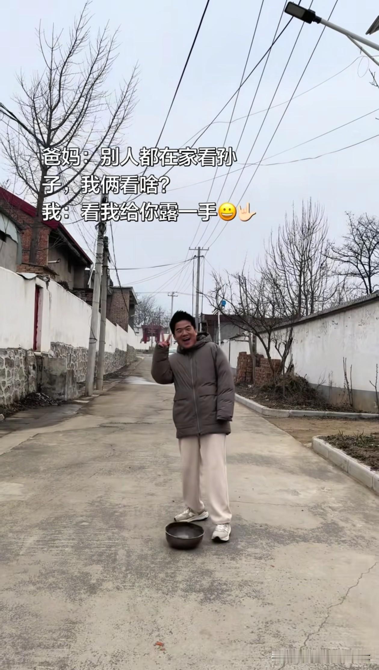 大年初二, 宇辉又回村炸狗盆了, 大家看看回村前的宇辉和回村后的宇辉是不是判若两人。 回村前,是身着笔挺西装、一步三摇的“霸道总裁”,气场全开,走到哪里都带着从容的质感。 回村后,秒变穿着棉服阔腿裤的邻家小伙,站在乡间小路上,对着镜头比耶,脚下还摆着熟悉的狗盆。 在外能策马扬鞭闯天地,回家能彻底放飞自我,任你西装革履多光鲜,一脚踏回村里,终究逃不过这份刻在骨子里的接地气。