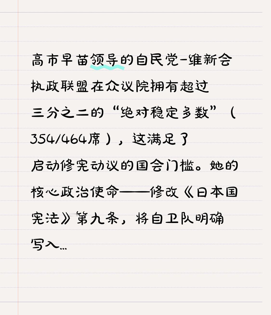 高市早苗领导的自民党-维新会执政联盟在众议院拥有超过三分之二的“绝对稳定多数”(354/464席),这满足了启动修宪动议的国会门槛。她的核心政治使命——修改《日本国宪法》第九条,将自卫队明确写入宪法——将从政治口号迅速转化为立法程序。预计新内阁成立后,将立即着手推动相关讨论和草案拟定,寻求在任期内完成这一“历史使命”,从而在法律上终结“战后体制”。 高市早苗当选日本首相将如何影响中日关系 高市早苗修宪的可能性有多大 日本高市早苗内阁集体辞职你怎么看