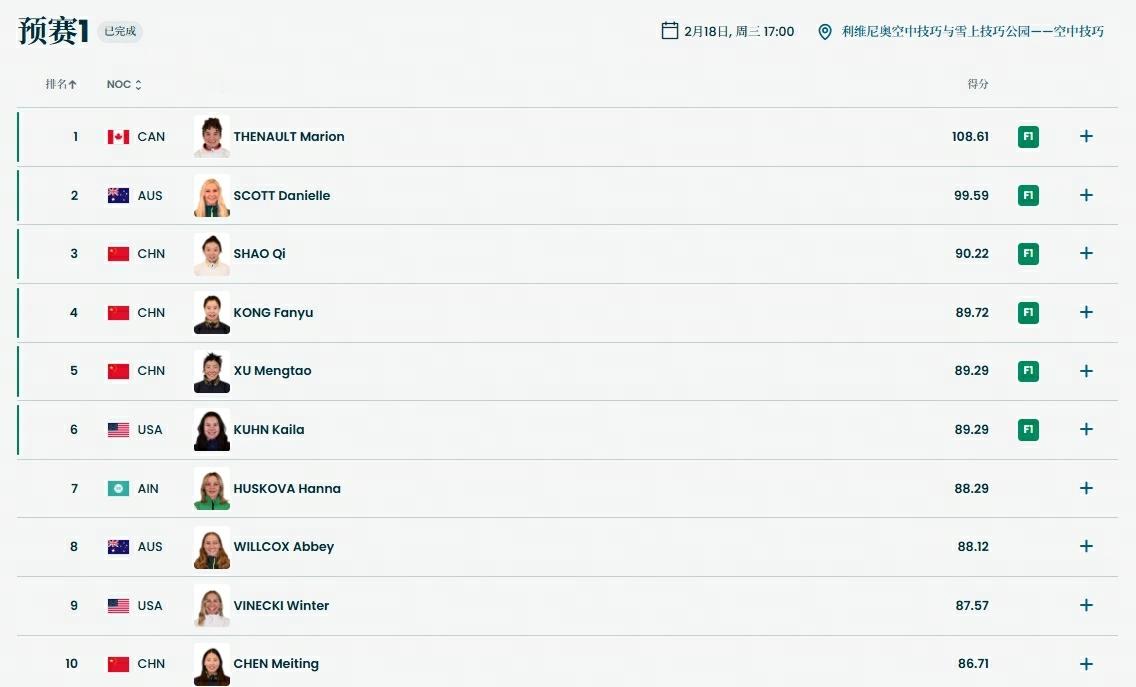 冬奥会,自由式滑雪女子空中技巧预赛第一轮,中国选手邵琪获得90.22分,孔凡钰89.72分,徐梦桃89.29分,分别位列第3、4、5名,晋级决赛。另一位中国选手陈梅婷得分86.71,排名第10,将参加预赛第2轮,争夺最后6个决赛资格。加油!