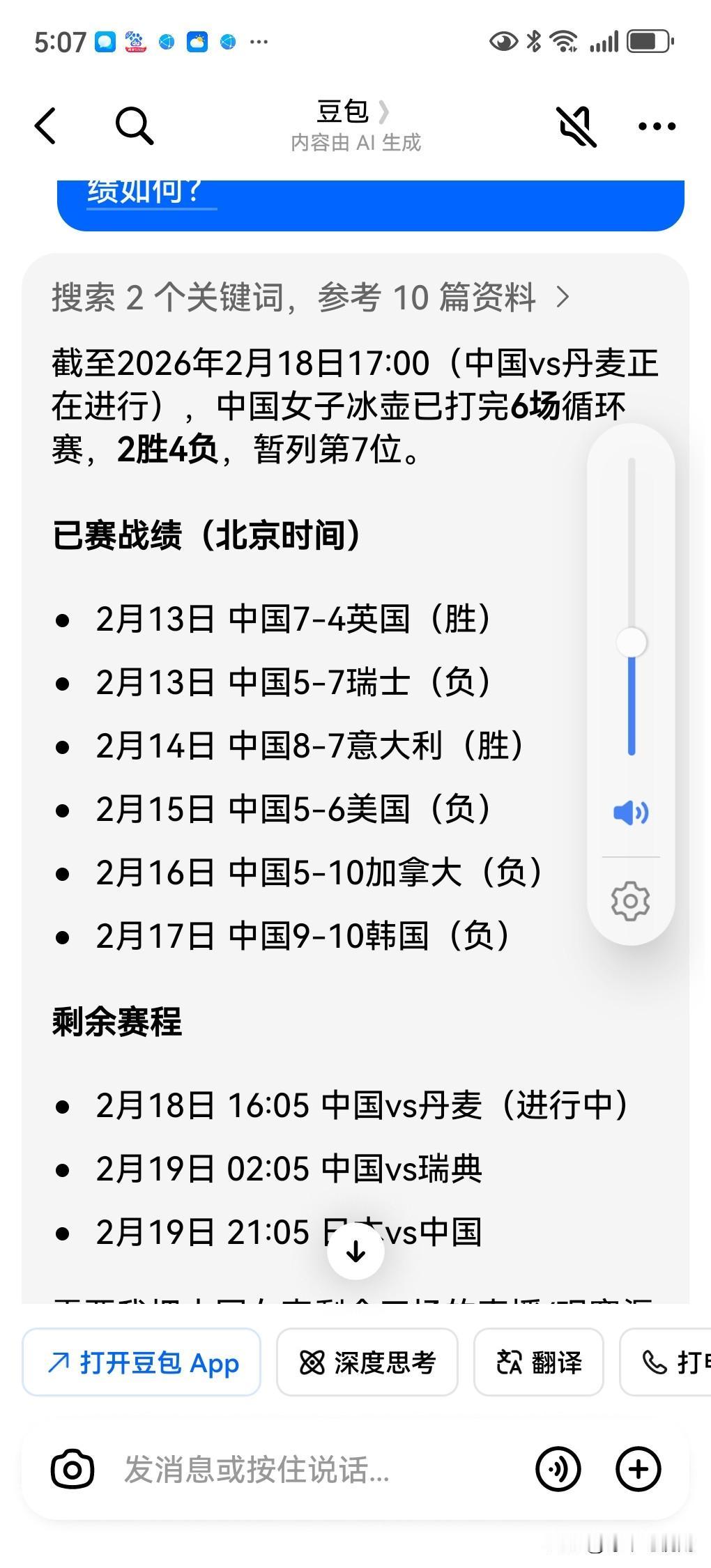 1:2落后,中国女子冰壶队先手最后一投完成后,丹麦队有两颗得分壶。央视评论员还大赞:好! 接下来轮到丹麦队最后一壶,结果把中国队没有挡住的最后那颗壶成功打走。丹麦队单局得4分。 我就不明白了,那声好是根据什么喊出来的呢?稍稍有点常识的也知道这个球没有旋进去,没有藏住。不能说是失误吧,但绝不是一次好投。我们的解说,评论呐。这也太不职业了? 目前中国女子冰壶已经结束了六场循环赛,战绩是4胜2负。 现在进行的是循环赛第五场,中国对丹麦的比赛。 现在场上比分是5:6,丹麦队后手局。作为生死战的中国队形势依然很严峻。