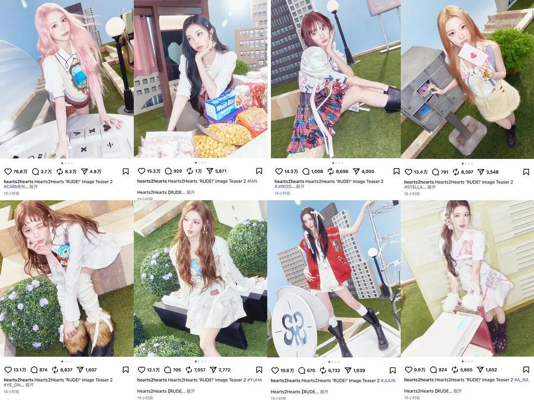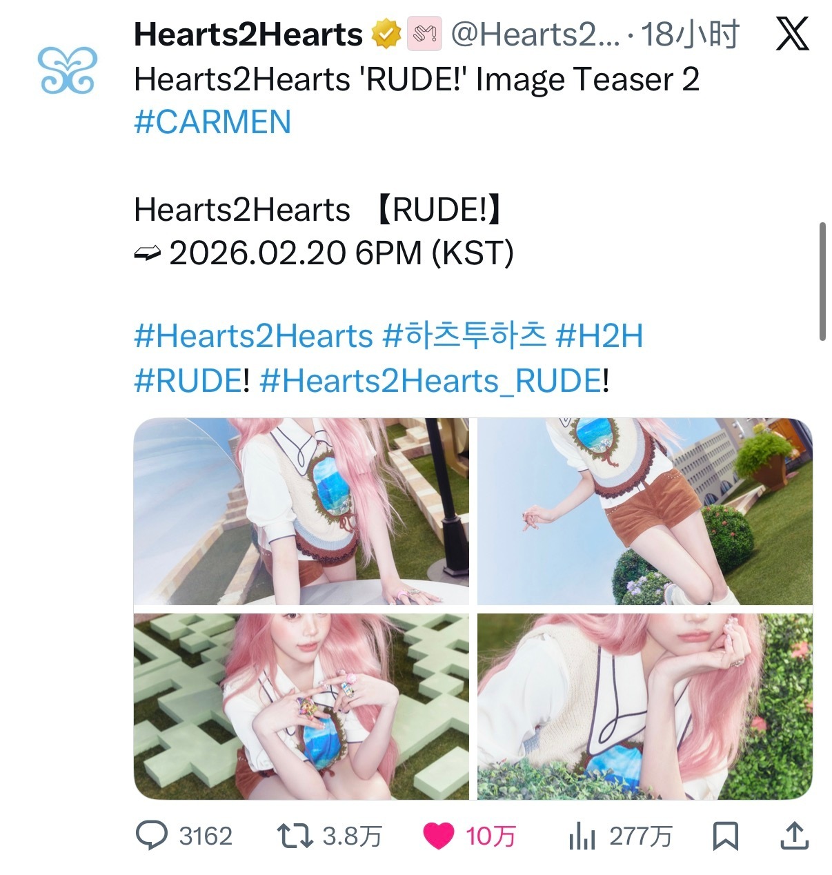 Carmen粉发预告点赞突破10w赞仅用时18小时13分这是Hearts2Hearts官推第一条10万赞推文IG目前点赞76.8w,有可能破百万