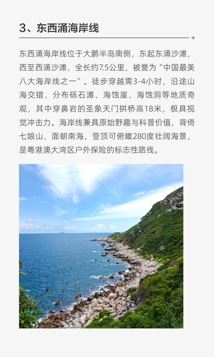 南澳五湾连穿徒步路线串联西涌等海湾,强度高需防晒装备。牛奶排海岸线陡峭,适合冒险者。东西涌海岸线兼具原始与科普价值,徒步3-4小时。海柴角海岸徒步路线全长16公里,强度大。七星湾至桔钓沙路线穿越礁石区,终点沙质细腻。红排角海岸线观赏火山岩地貌与海景。