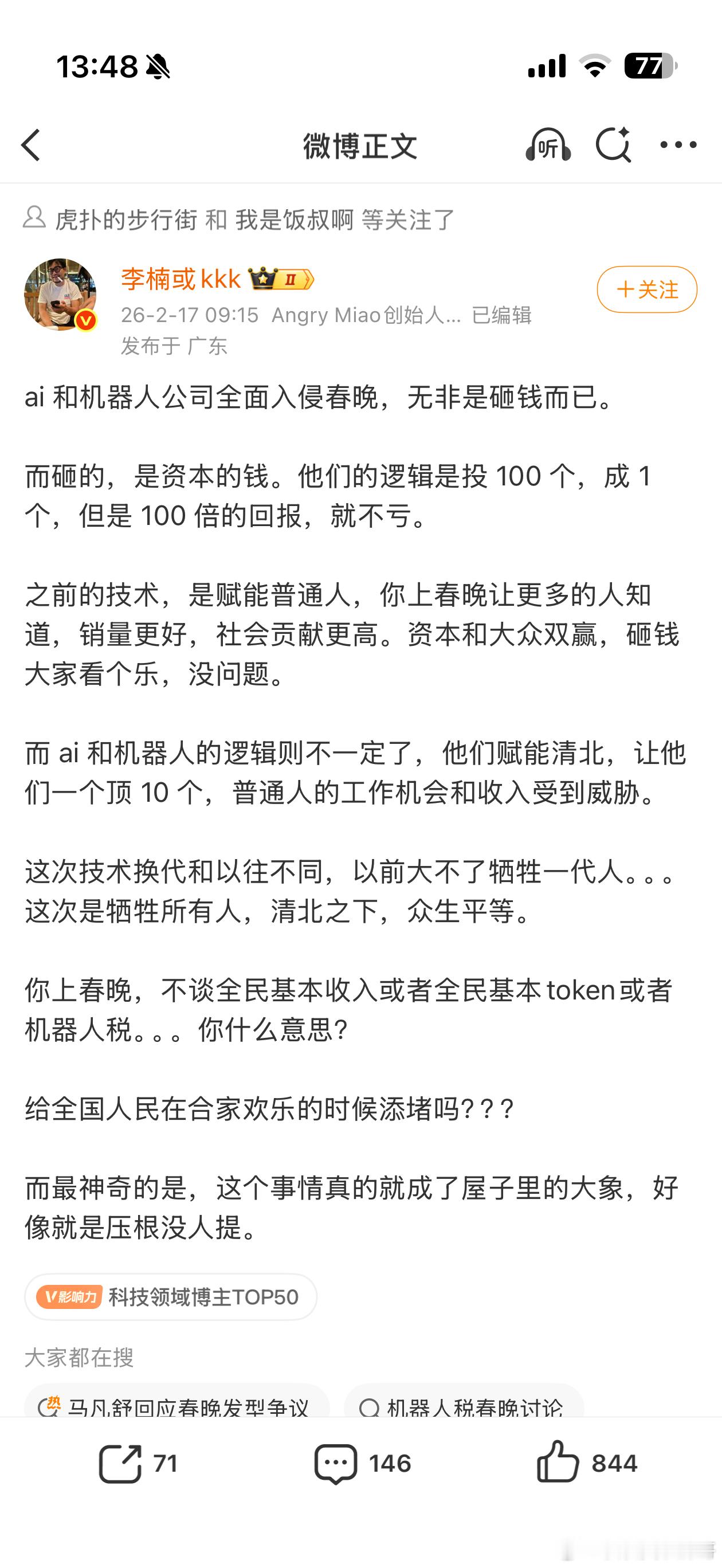 其实我和楠哥有不同的看法机器的发展 ai 的发展都是促进社会发展的机器人越发达,社会生产力越高,成本越低对于普通人来说消费水平反而是得到了提升交通工具的提升运力会让马夫失业吗?实际上创造了更多的马夫岗位。因为造钢铁机器比养马容易,运输成本也更低。成本低了更多的人愿意出行。工业革命让很多人失业了,但是养活了更多人。生产力工具替代人无非就是降本增效,成本低了售价才能低,才能让更多的人消费得起啊。还是车,福特引入流水线是让汽车工人失业了吗?没有,反而让更多的人买得起汽车,让更多的人参与了就业。贵的产品往往是因为产业链太长,效率太低所以贵同样的,如果这个产品效率提升了,售价降低了,市场扩大了,那么它背后的产业链规模也是成倍的增长。一样能养活更多的人。再想一想,如果没有机器人如何实现共产呢?物价成本都是来自于劳动成本,如果机器人替代人类实现 0 成本,全自动。物价不也就等于 0 了吗?机器人人工智能机器人