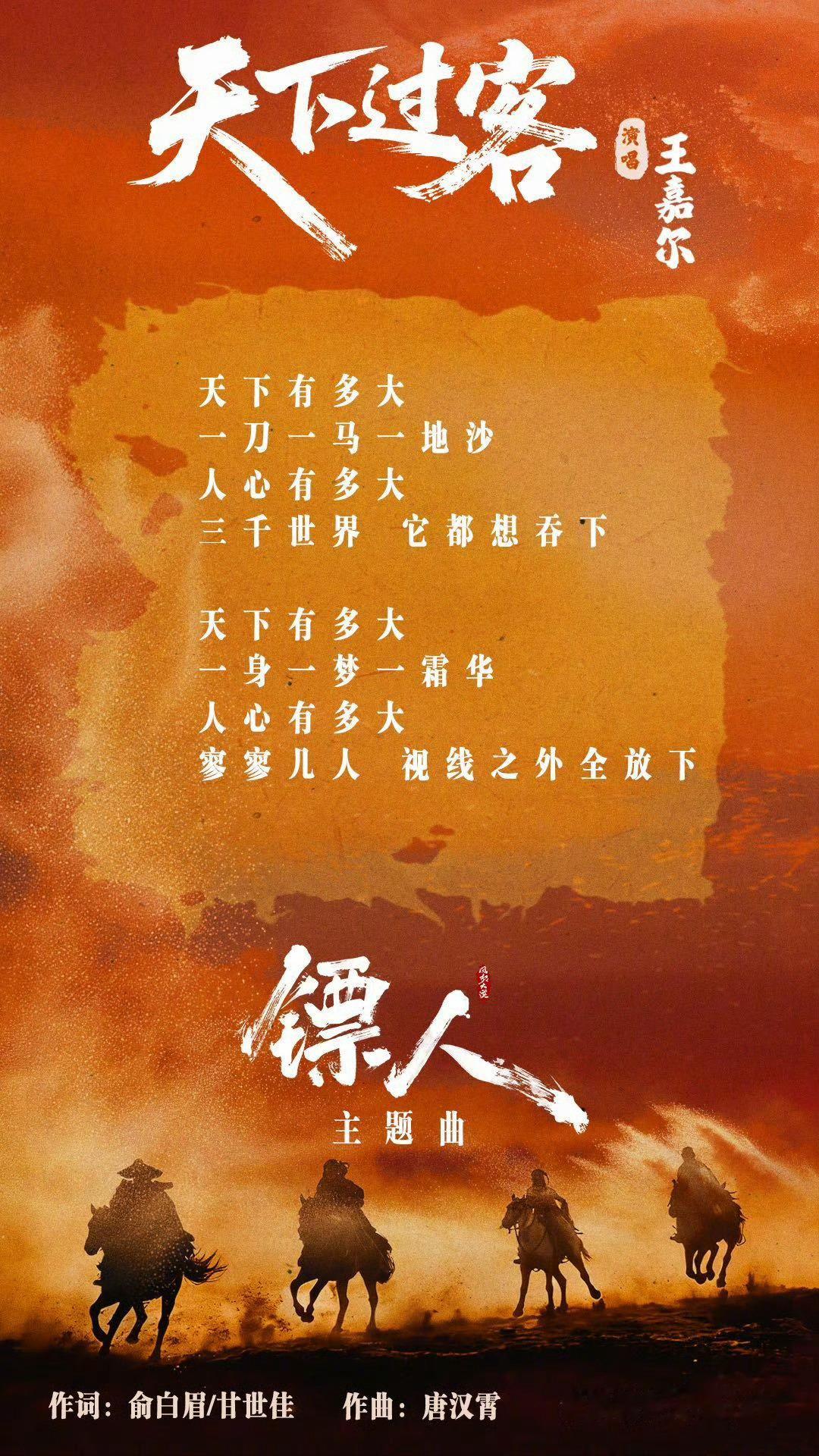 王嘉尔演唱真是适配镖人去看《镖人》的朋友们,真心劝你们别亮灯就着急走。本来正片看完,大漠江湖的劲儿还没散,王嘉尔这首《天下过客》一出来,直接把情绪又顶满了。他的烟嗓自带风沙感,既有拔刀出鞘的凌厉,又有天地任行的洒脱,和片尾策马赴长安的画面贴得严丝合缝。在影院安安静静听完一整首,才觉得这场江湖之旅,才算真正落了圆满。
