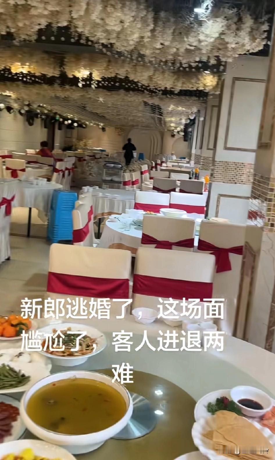 新郎逃婚了!这场面很尴尬了,客人进退两难,真的跑了,那要不要退彩礼? 不是自己喜欢的,可以在订婚前就说清楚,也不要委屈自己,总比在结婚当天自己没有担当,逃婚让新娘和一大家子人难堪强吧。菜都上来了,不吃主办方也要付钱的,要是客人,先坐着慢慢吃再说吧,吃啊,十人一桌啊