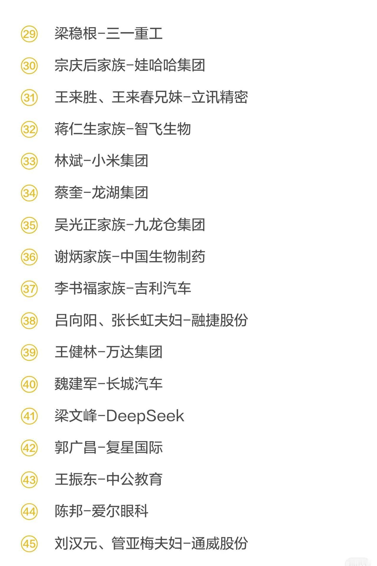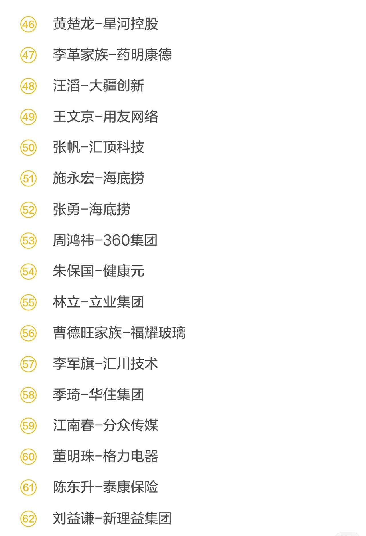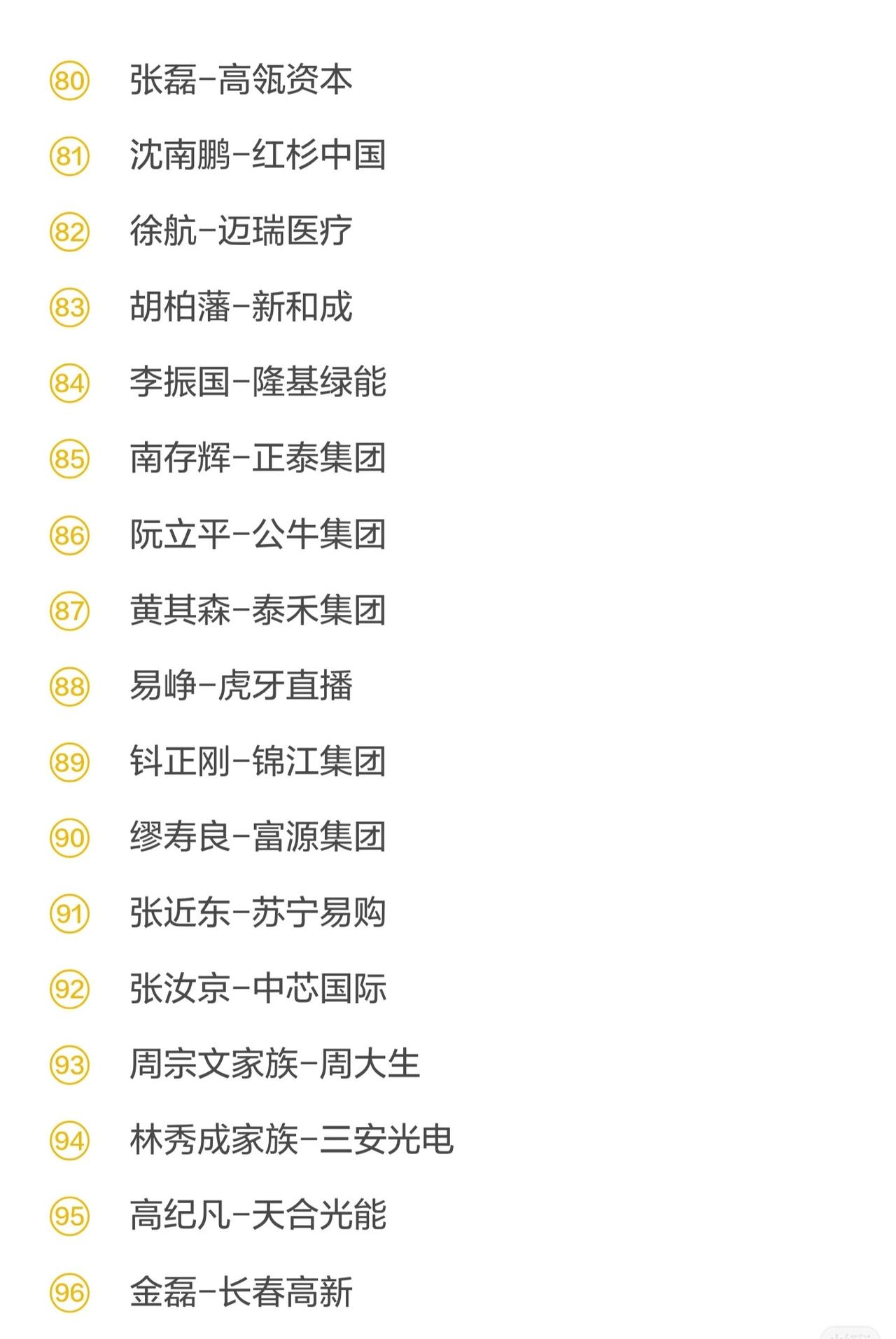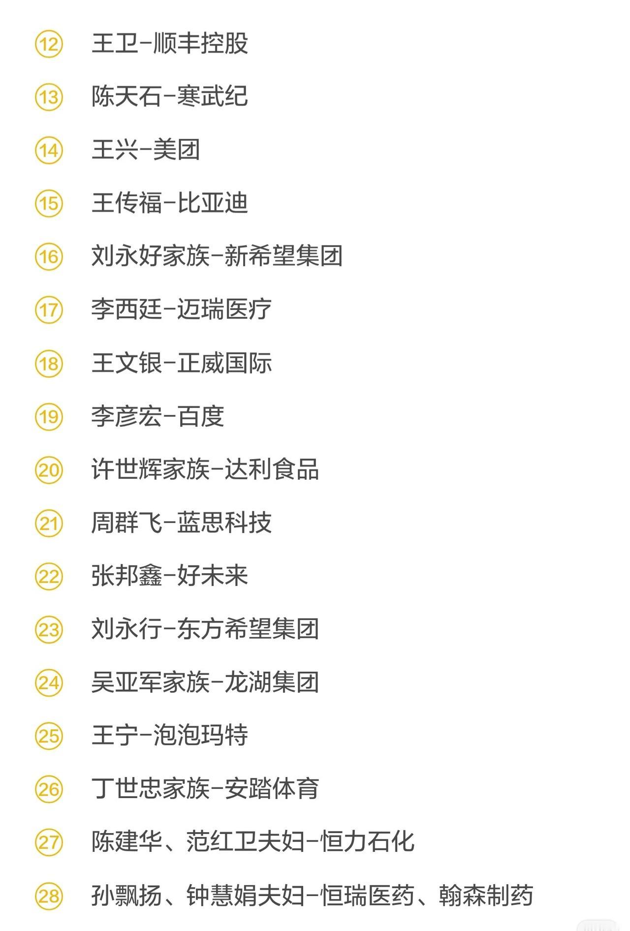 中国富豪榜前100名名单,按排名顺序列出姓名及所属企业,涵盖互联网、科技、制造、地产、医药、消费等领域,数据来源为胡润百富榜、福布斯中国内地富豪榜和彭博亿万富豪指数。
