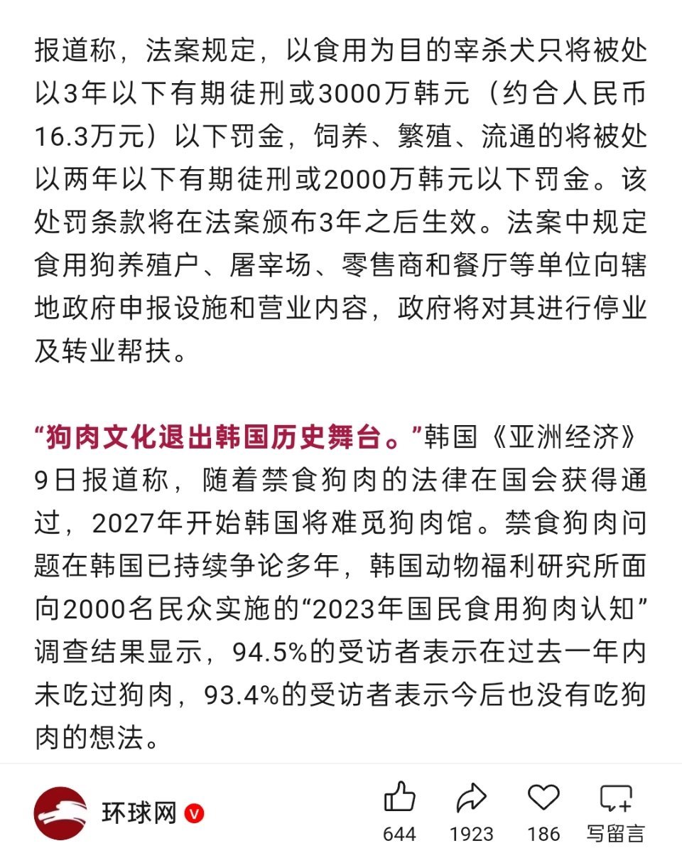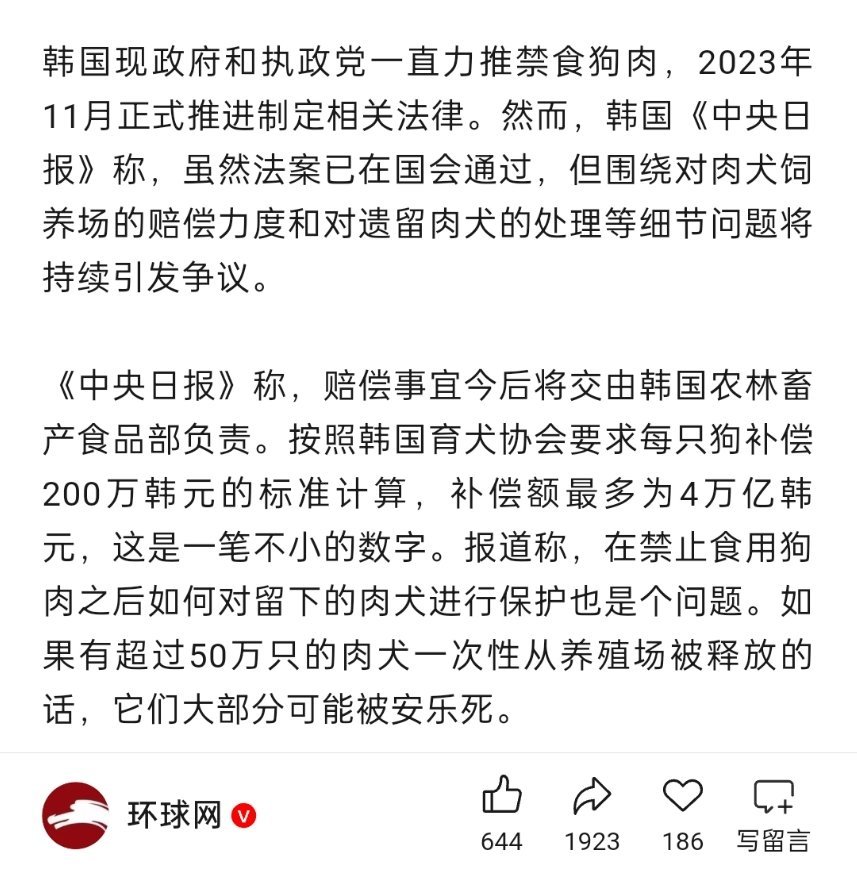 韩国2027年禁食狗肉法生效🔻狗肉文化要退出韩国的历史舞台了。🔻如果每只狗补偿200万韩元,补偿额可能达到4万亿韩元,绝大部分肉狗将被安乐死。