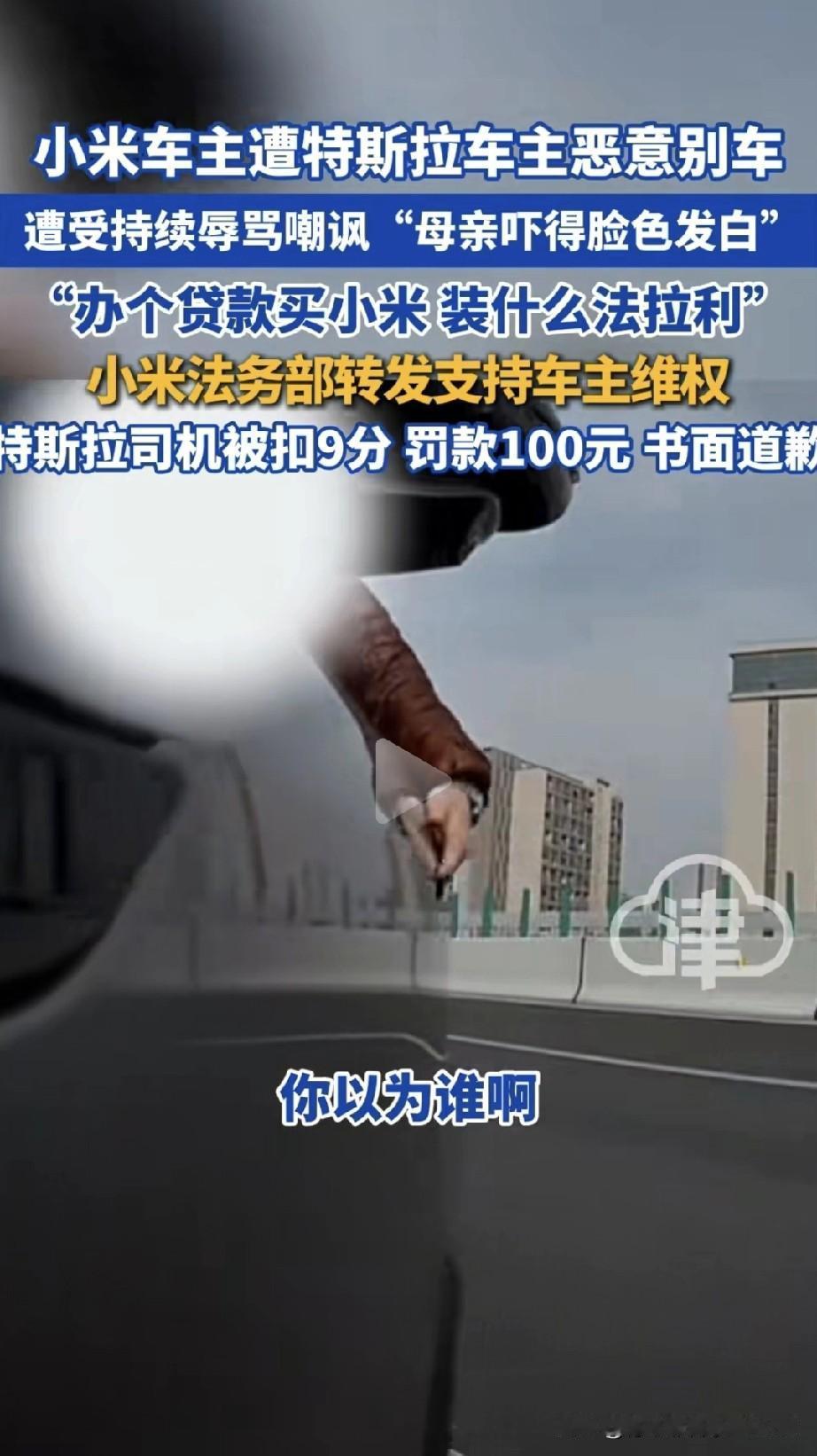 小米法务部转发声援小米车主维权。 近日,浙江宁波一位小米车主驾车送母亲去探亲,途中遭遇特斯拉车主恶意别车,还持续遭受辱骂与嘲讽。 原来,这位小米车主在高架上变道未成功,特斯拉车主未予让行,这瞬间激怒了特斯拉车主。在多次强行超车失败后,特斯拉车主开始恶意针对小米车主。他找准机会超越小米车后故意放慢车速封路,时而猛打方向盘,时而急刹车,甚至逼停小米车主,还下车辱骂道:“掏空家底买个小米,以为自己很牛吗?”这吓得小米车主的母亲脸色苍白、情绪不安。小米车主冷静下来后,选择取证报警。最终,特斯拉车主因危险驾驶罪受到处罚,驾驶证被扣9分,罚款100元。 就事论事,此事与小米和特斯拉这两个品牌本身并无关联,问题出在人身上。老话说得好,心里污浊的人看什么都脏,内心匮乏的人看什么都自卑。这与开什么车无关,只和个人素质有关。 这件事其实很明了:错在人,而非车,更不是品牌。 不管开的是小米、特斯拉还是其他车,危险驾驶、恶意别车、逼停、辱骂等行为,既违法又缺德,已然触犯交规、危害公共安全,该处罚就得处罚,没什么可狡辩的。 因为别人开什么车就进行嘲讽、攻击,本质上是把优越感建立在车标之上,既自卑又狭隘。 品牌之间可以存在竞争、有个人喜好,但绝不能上升到人身攻击和路怒犯罪。 车主冷静取证、报警处理,是理性且正确的做法,没有被情绪左右,值得肯定。 总结来说:车只是工具,人品才是根本。路怒解决不了问题,只会徒增危险。 对此,大家怎么看?