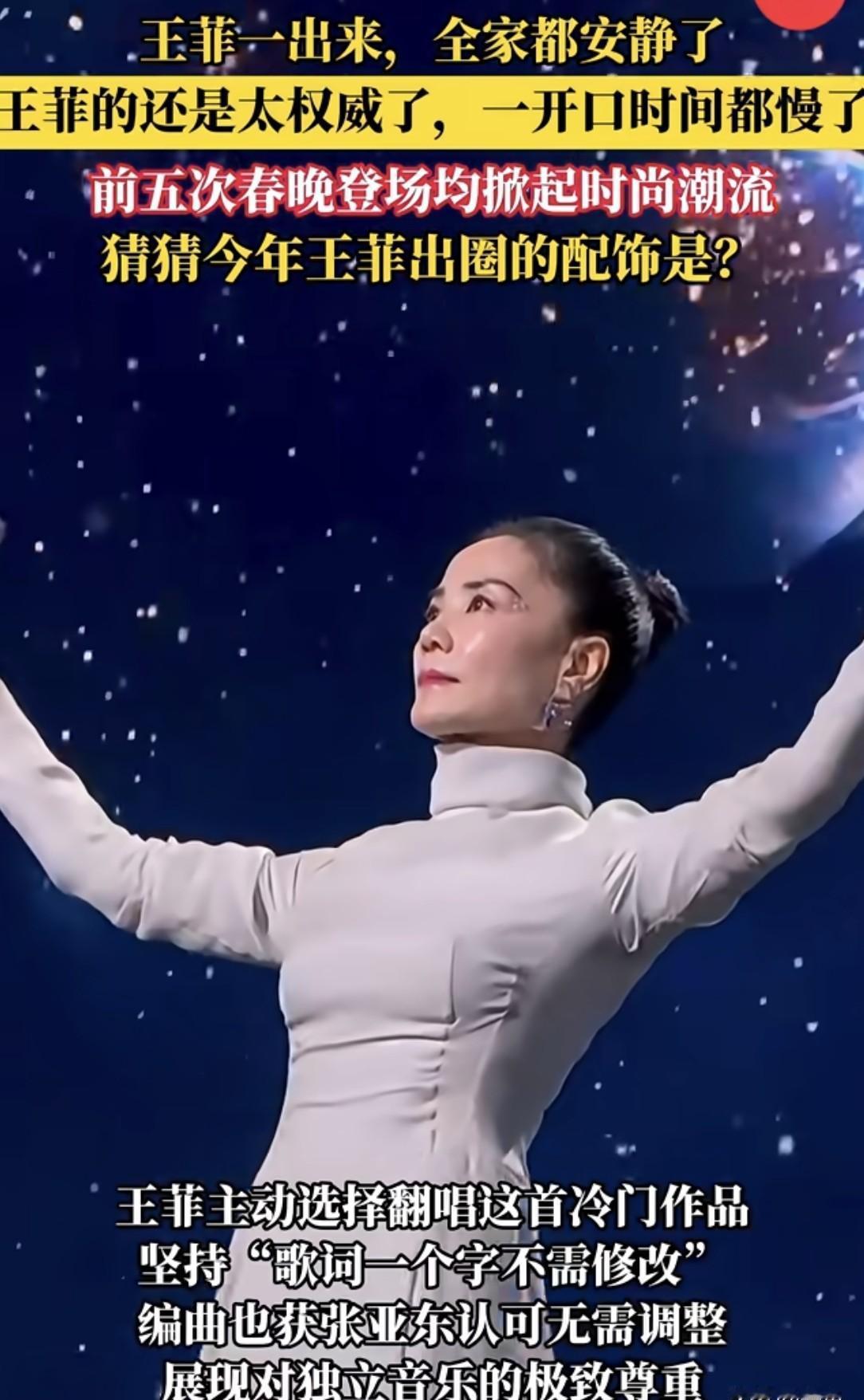 春晚,别人恨不得把家底穿身上,王菲倒好,一套“居家服”就上了。 造型师钱赚得最轻松的,估计就是她了。 从不华丽抢镜,连妆都淡得像没化。 唯独今年换了副水滴耳环,比去年那“炸虾片”顺眼多了。 可一开口,全场都安静了。 实力派就是这样,不用靠奇装异服博眼球,一张嘴就镇住场子。 这哪是佛系? 这分明是品牌策略。 她一直用最简单的姿态告诉我们,真正的“天后”根本不屑与“网红”争艳。 别再盯着衣服了,你该学的是她那份“老娘就长这样”的底气。