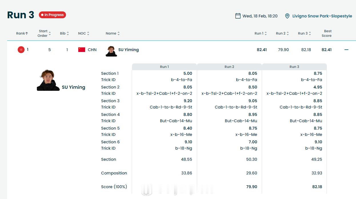 单板滑雪男子坡障技巧决赛苏翊鸣单板滑雪坡障技巧决赛冬奥会 生日男孩苏翊鸣第三轮得到82.18分,仍然排名第一。后面就是熬人的等待!
