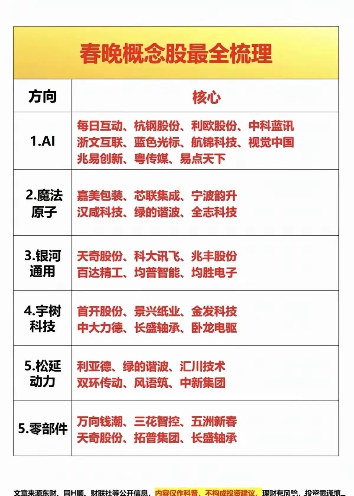 春晚机器人上热搜,机器人概念全景梳理:1.宇树科技相关:①参股:金发科技、首开股份、卧龙电驱、吉华集团、景兴纸业、荣晟环保②合作商:长盛轴承,宏昌科技,盛通股份,新洁能,凌云光,德邦科技,凯旺科技。③供货:绿地谐波,中大力德,长盛轴承,鸣志电器,新洁能,卧龙电驱。2.松延动力:绿地谐波,奥普特,利亚德。3.魔法原子:芯联集成,夏厦精密,绿地谐波,宏昌科技,富乐德。4.银河通用:天奇股份,百达精工,鸣志电器,绿地谐波,君逸数码。