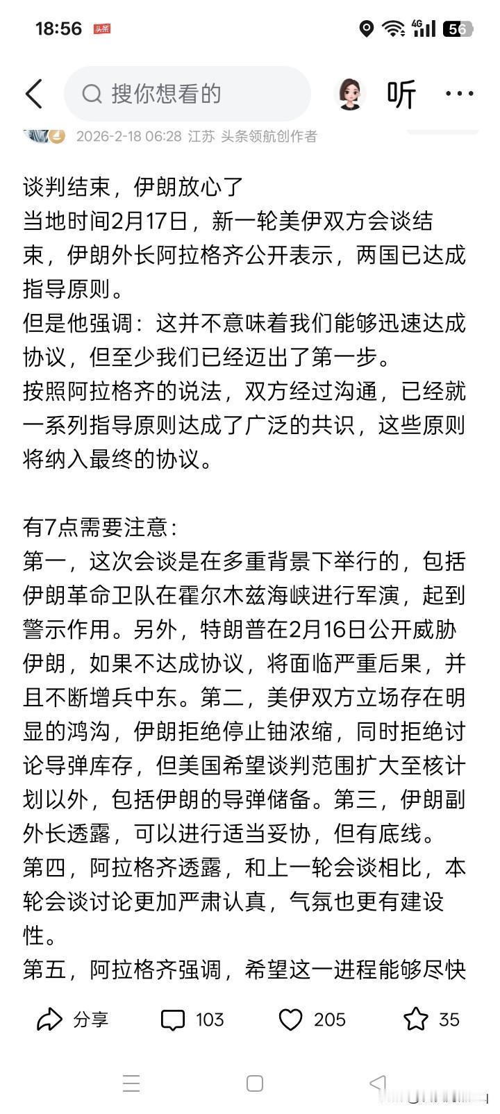原则协议就是个开头? 伊朗与美国2月17日在日内瓦的谈判已经结束,伊朗外交部长阿拉格齐表示:伊朗与美国已经达成指导性原则。 由此好像可以预见,估计美国一时半会儿也不会对伊朗采取军事行动。但是,所谓的指导性原则,实际上很可能就是个态度的问题,而并非实质上的问题。因此,伊朗与美国谈判的路可能还很长,最终是否会达成双方真正认可的协议,现在下结论还是太早。 再说,达成指导性原则,似乎也不一定就彻底的意味着不会再发生军事行动和战争,因为很多问题就是出现在具体的问题或细节。尤其是,伊朗的真正权力似乎掌握在精神领袖哈梅内伊手里,而不是外交部长阿拉格齐的直接上司总统佩泽希齐杨手里。 所以,最好还是抱着谨慎的态度看待他们谈判的结果。