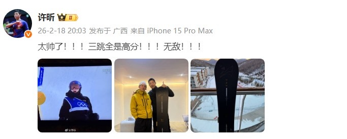 许昕在社媒写道:“太帅了!!!三跳全是高分!!!无敌!!!”
