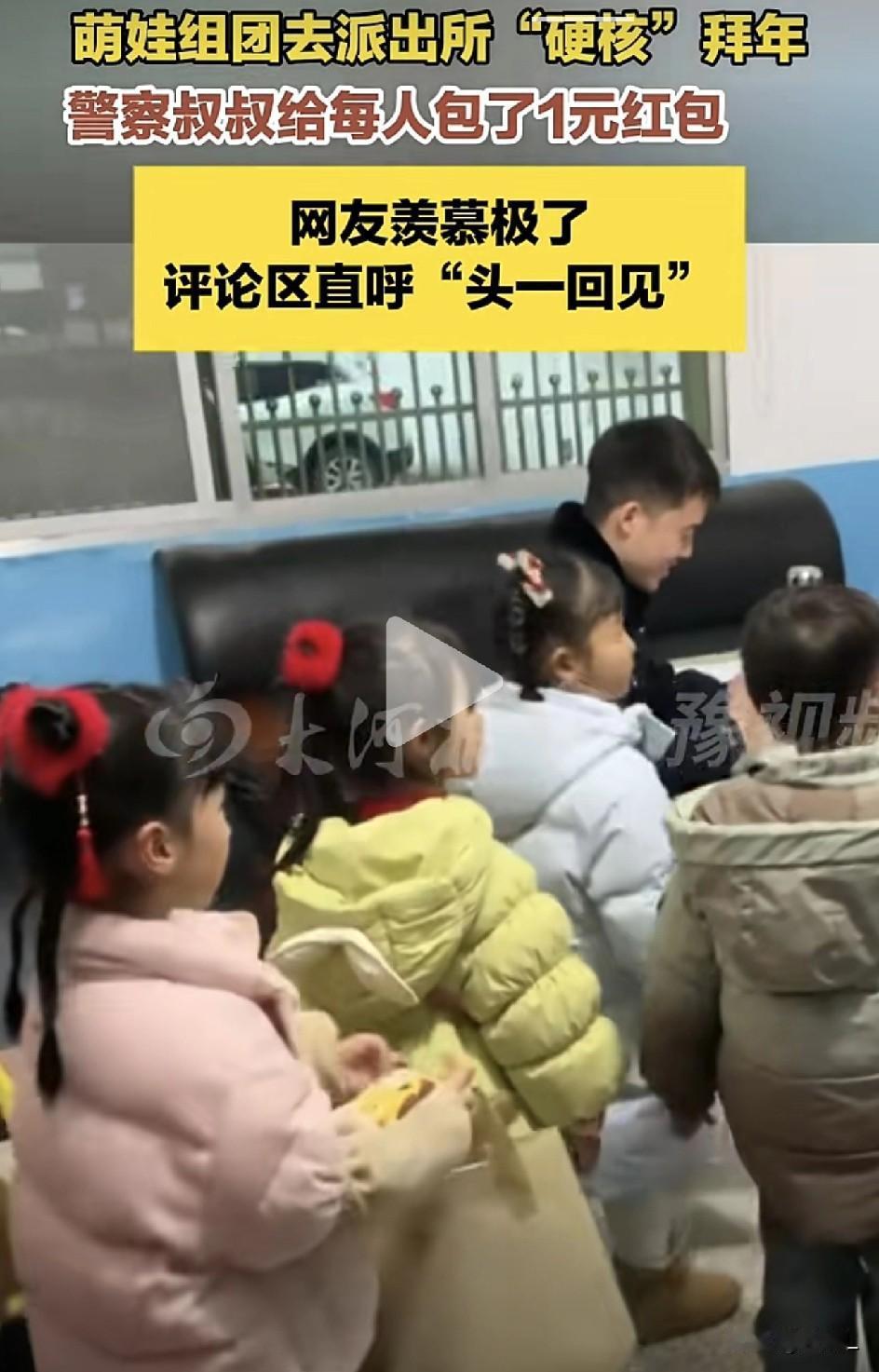 头回见!湖南平江小孩哥小孩姐,组团去派出所拜年,领到的居然是崭新的1元红包! 湖南平江这波春节操作,直接把全网看慕了! 一群小孩哥、小孩姐,排着队冲进派出所,奶声奶气给警察叔叔拜年送祝福,领完红包开开心心走人。 红包里是张崭新的1块钱! 外地网友直接炸锅: “第一次见去派出所拜年的!” “钱不重要,这警民关系也太暖了!” 当地回应来了:这不是整活,是老传统! 这边叫“送恭喜”,也叫“辞岁”。 大年三十、大年初一,小朋友们挨家挨户说吉祥话,主人家就发1块、10块的小红包,或者给糖果、铅笔、作业本,图个热闹喜庆。 派出所也入乡随俗,提前备好一沓1元红包,孩子来了就发,图个吉利,暖乎乎的年味直接拉满! 不认生、不生分,一句祝福换一份心意,这样的年俗,太治愈了! 小小的一个红包,拉近了邻里的关系,也融入了浓浓的年味与祝福! 而10后的小孩哥小孩姐们居然能想到去派出所硬核拜年,不得不让人佩服新脑子就是好使! 更惊奇的是,派出所也依照风俗准备好红包、零食,静待拜年的小朋友们上门,更是出乎了全网的意料! 如此接地气的风俗、如此接地气的派出所,着实让人羡慕!大写的赞[赞][赞][赞] 素材来源:大河报,侵联删!