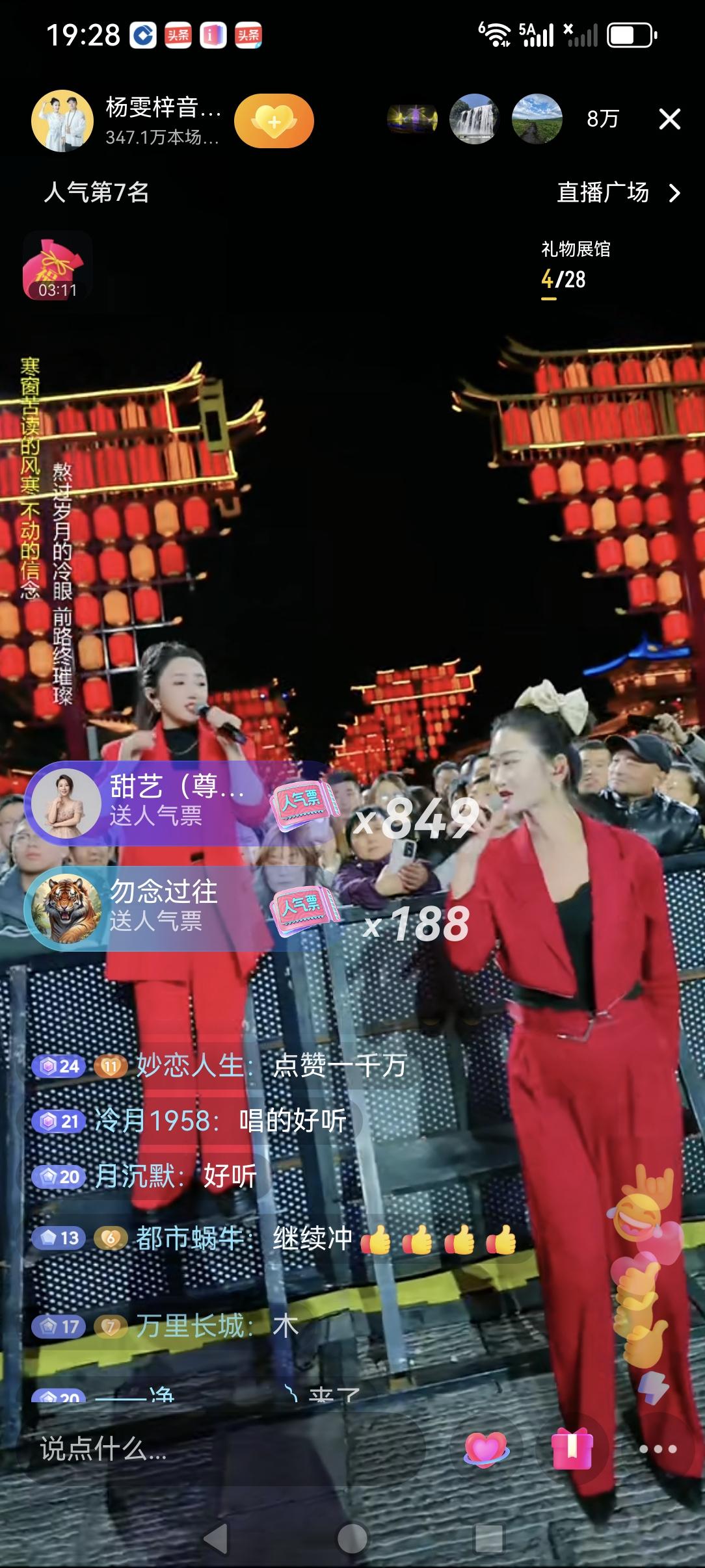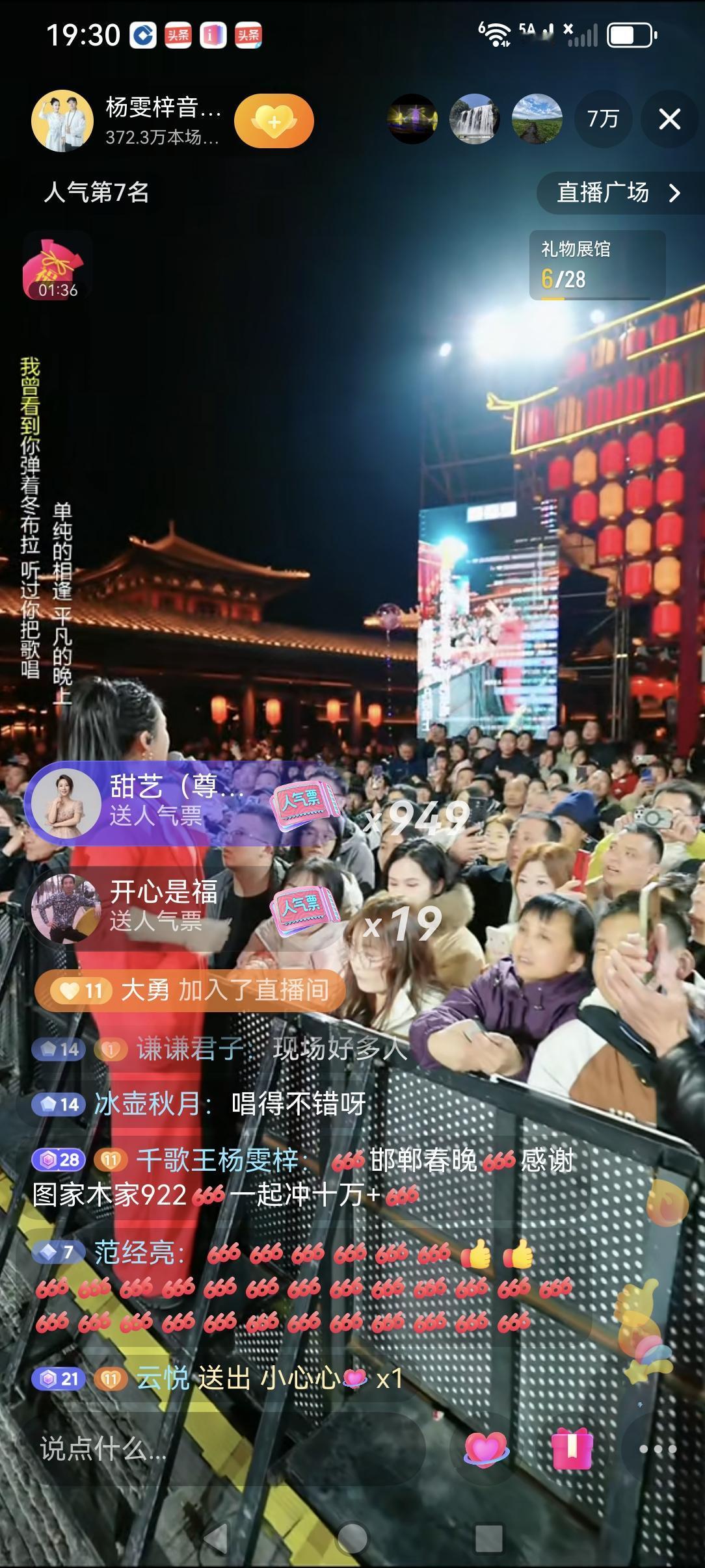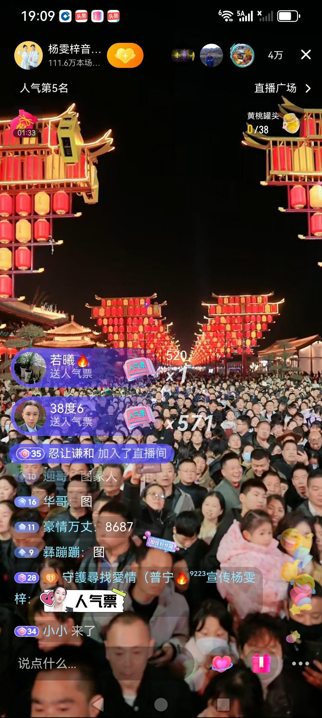 扬雯梓这两天去了河北邯郸大名县大名府宋街去直播。说实话,她的唱功真的可以,现场人山人海,可是直播间人气就是上不去,上四万用了10分钟左右,但是一直到二十分钟也还是只有四万,上8万用了半个小时左右,后面又掉下来了到7万,算是人气现场比直播间多的了吧!她的唱功是真的可以。 互联网抖音直播这东西主要还是平台及控场,主持团队等,平台推流是第一位的。也不是知道这个赛道会维持多久,抖音直播有几年了,以后肯定还会有一种更新的方式出现。这么多年来,抖音直播平台,互联网平台确实是让一小部分人赚取了一定的财富,当然还要靠多方面原因,首先是要注册帐号,还有就是要为此努力,要找对方法,还要靠平台推流,这个是最重要的!希望扬雯梓的歌唱道路越来越好!