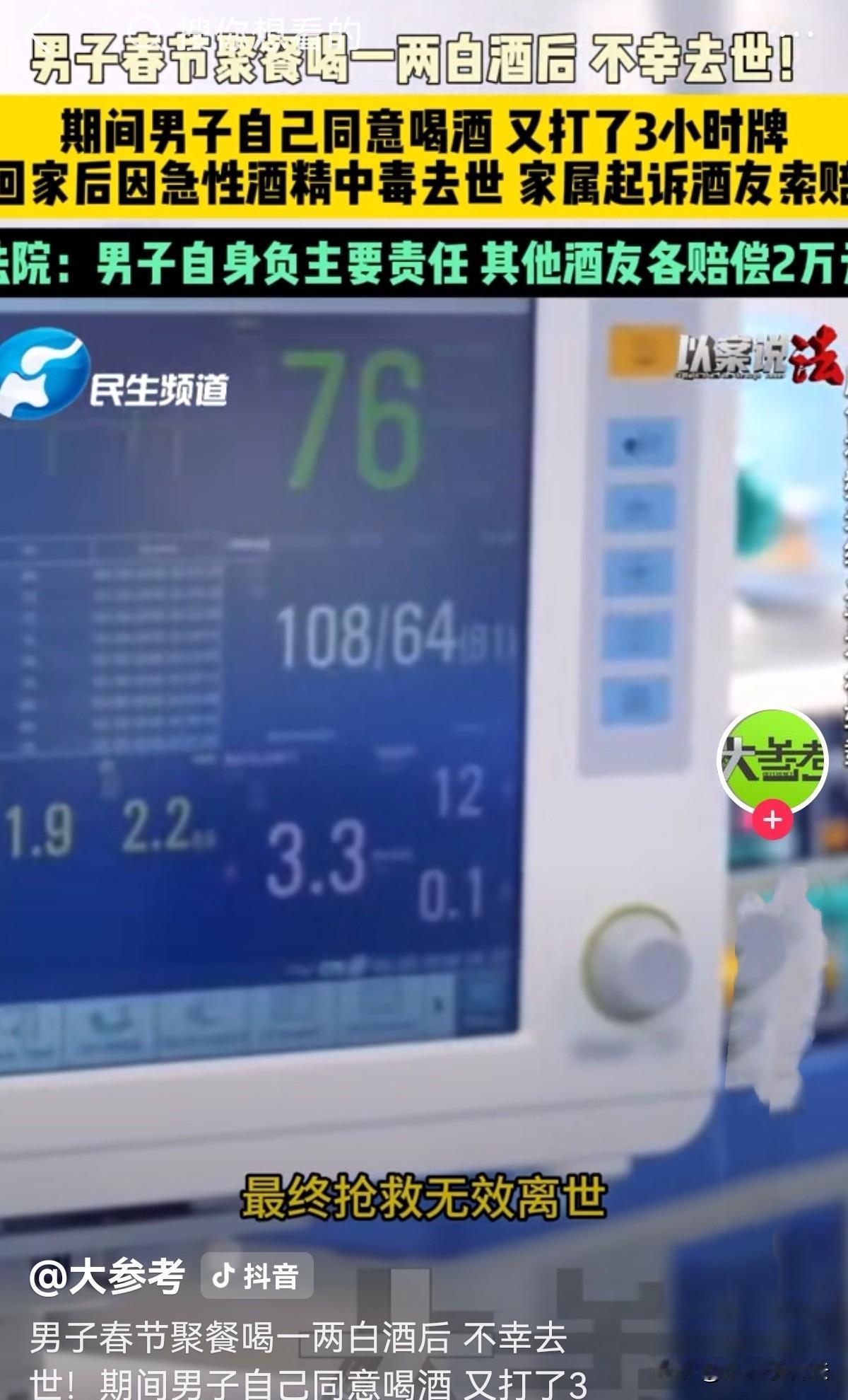 湖北荆州,53岁男子在一好友陪同下去另一朋友家去拜访。朋友热情招待,准备了一桌丰盛的佳肴,还询问是否饮酒。男子表示想喝,其中5人,他喝了1两散白酒,还有一人喝了2两,再没劝酒。之后男子跟大家打了3小时牌,然后坚持自行驾驶电动三轮车回家。谁知,回家后,男子就觉得身体不舒服,去医院确诊为脑干梗死、急性酒精中毒,于次日凌晨不幸离世。其家属将同桌共餐者全部告上法庭,法院判决很意外! 2025年2月,正值春节热闹的时候,53岁的龙某想着去朋友杨某某家拜个年,联络一下感情,便约上了另一位朋友朱某某一同前往。 接到龙某和朱某某的到访,杨某某心里格外高兴,连忙热情地张罗饭菜,还叫来了其他几位朋友一同共餐。 到了吃饭的时候,杨某某客气地询问大家要不要喝点酒,龙某和杨某德都没拒绝,想着过年难得相聚,少喝一点助兴也无妨。 杨某某便拿出家中存的散装白酒,他很有分寸,只给龙某倒了大约1两白酒,给杨某德倒了有2两,桌上其他人都没喝酒。 大家说说笑笑的,整场饭局气氛轻松和睦,没有任何人劝酒、拼酒,大家吃完饭后,还坐在一起打牌娱乐,消磨时间。 打牌时,龙某的状态看起来一切正常,说话清晰、行动自如,完全看不出有任何不舒服的地方。 杨某某、龙某、杨某德还有一人,他们4人打了3个小时牌,期间朱某某没参与,之外外围看热闹。 等到牌局结束,天色已很晚,龙某执意要自己骑电动三轮车回家。 其实大家心里都清楚,酒后骑车存在安全隐患,纷纷劝说龙某留下来,或者找人送他回去。 可龙某觉得自己只喝了一点点酒,根本没问题,看他态度十分坚决,不肯接受大家的好意。便没有再强行劝阻,就这样让龙某独自离开了。 谁也没有想到,这场看似平常的分别,竟成了永别。 当天晚上9点左右,回到家的龙某突然感到身体剧烈不适,家人惊慌失措,赶紧将他送往医院抢救。 经过医生诊断,龙某为脑干梗死、急性酒精中毒,尽管医院全力救治,却依旧没能留住龙某的生命, 第二天凌晨,53岁的龙某不幸离世。 年轻的生命突然离去,让龙某的家属悲痛欲绝,他们无法接受这个残酷的现实。 家属认为一起聚餐的人没有尽到该有的责任,于是将共同聚餐的所有人一并告上了法庭,要求他们承担赔偿责任。 法院对整件事进行了详细的审理和调查。 《民法典》第18条规定:成年人为完全民事行为能力人,可以独立实施民事法律行为。 法院认为,龙某作为一个成年人,完全有能力认清自己的身体状况和酒量,也应该知道酒后骑车的危险性,可他却执意饮酒、独自骑车回家,对自己的死亡存在主要过错,理应承担主要责任。 《民法典》第1165条第1款:行为人因过错侵害他人民事权益造成损害的,应当承担侵权责任。 而杨某某作为聚餐的组织者,朱某某作为同行的朋友,虽然全程没有劝酒,主观上没有任何恶意。 但作为共餐者,他们对饮酒后的龙某负有安全保障义务,明明知道龙某酒后骑车有风险,却没有进行有效的劝阻,也没有将他安全护送回家,存在一定的轻微过失。 最终,法院依法作出判决,杨某某和朱某某各自赔偿龙某家属2万元。 这个判决结果一出,立刻引发了不少人的讨论。 有人觉得,主家做了饭菜好心招待,自己又没喝酒、劝酒,是他自己愿意喝的,判赔偿真冤!陪同一起去的朱某某更冤枉,他只是同行,一没喝酒二没打牌,这也能沾上边? 有人说,除了恶意劝酒,其他人都正常喝酒,即使互相倒点酒也是礼节,尊重,客气,也是酒桌上常有的举动,都是成年人自己应该把控,再说想治人于死地,就劝多喝点就能达到目的吗?真是可笑! 还有人说,做为朋友在一起喝酒,出了事,道义上还是要适当赔偿点。 对此您怎么看?