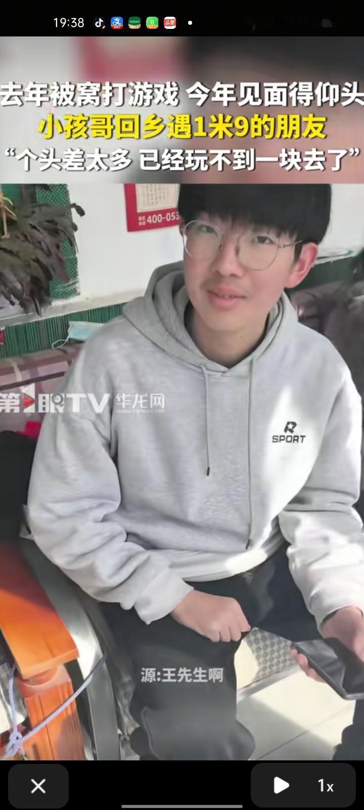 2月16日,潍坊市临朐县。去年在被窝里打游戏,今年见面得仰头,小孩哥回乡见到一米九的朋友。拍摄者王先生称,左边是自己的儿子,今年8岁,右边是叔叔家的弟弟,今年14岁,去年一米七左右,今年突然一米九多了。去年他们经常在一块玩,今年因为个头差太多玩不到一块去。