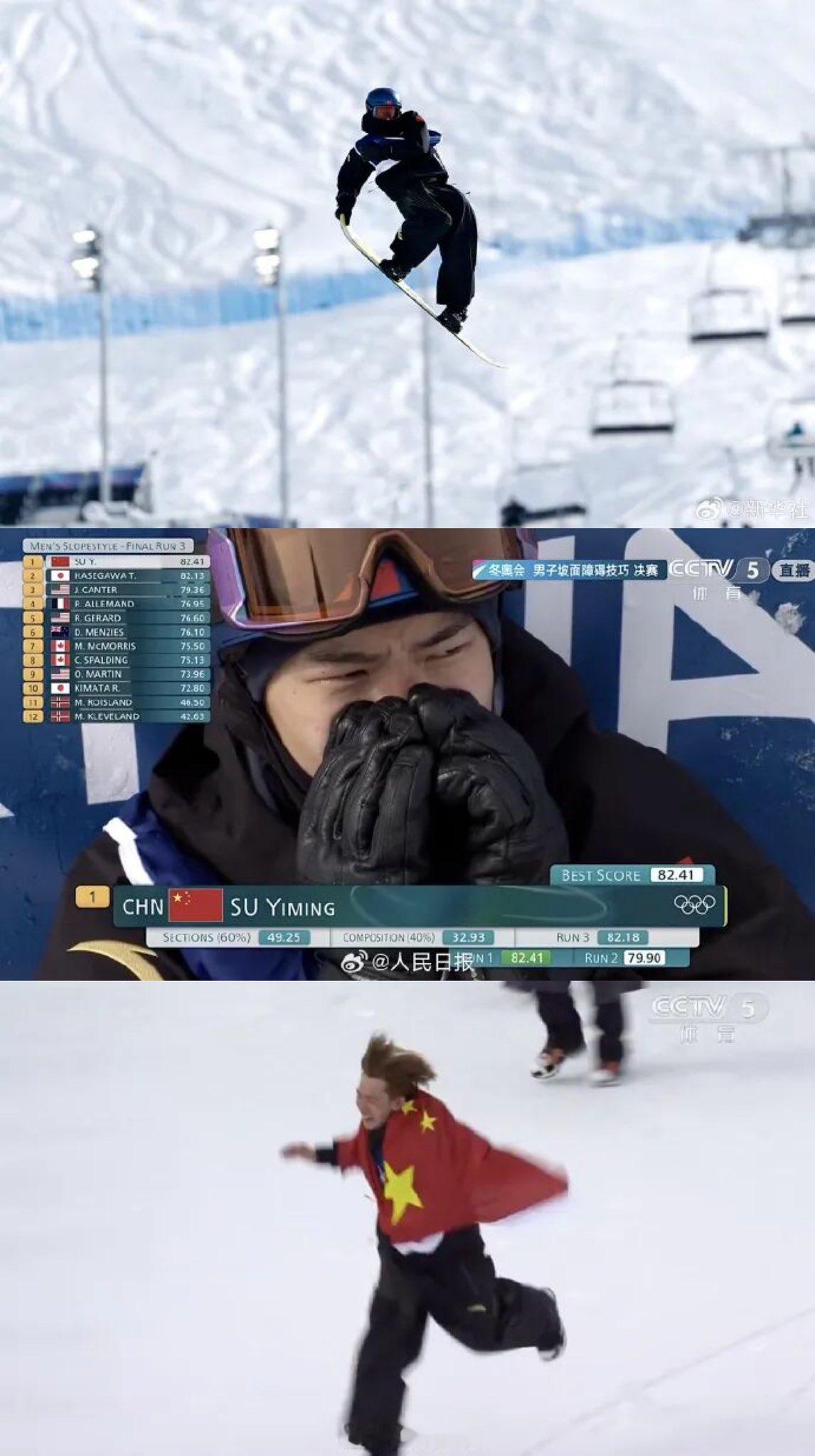 苏翊鸣金牌 本届冬奥会中国队首金也是中国单板滑雪坡面障碍技巧项目奥运首金苏翊鸣也成为首位在单板滑雪两个不同项目均获冬奥金牌的中国运动员首轮即拿出反脚 1800大招,获82.41 分全场最高。三轮滑行均稳定输出1440-1620-1800高难度组合,零重大失误。以0.28 分的微弱优势战胜日本名将长谷川帝胜