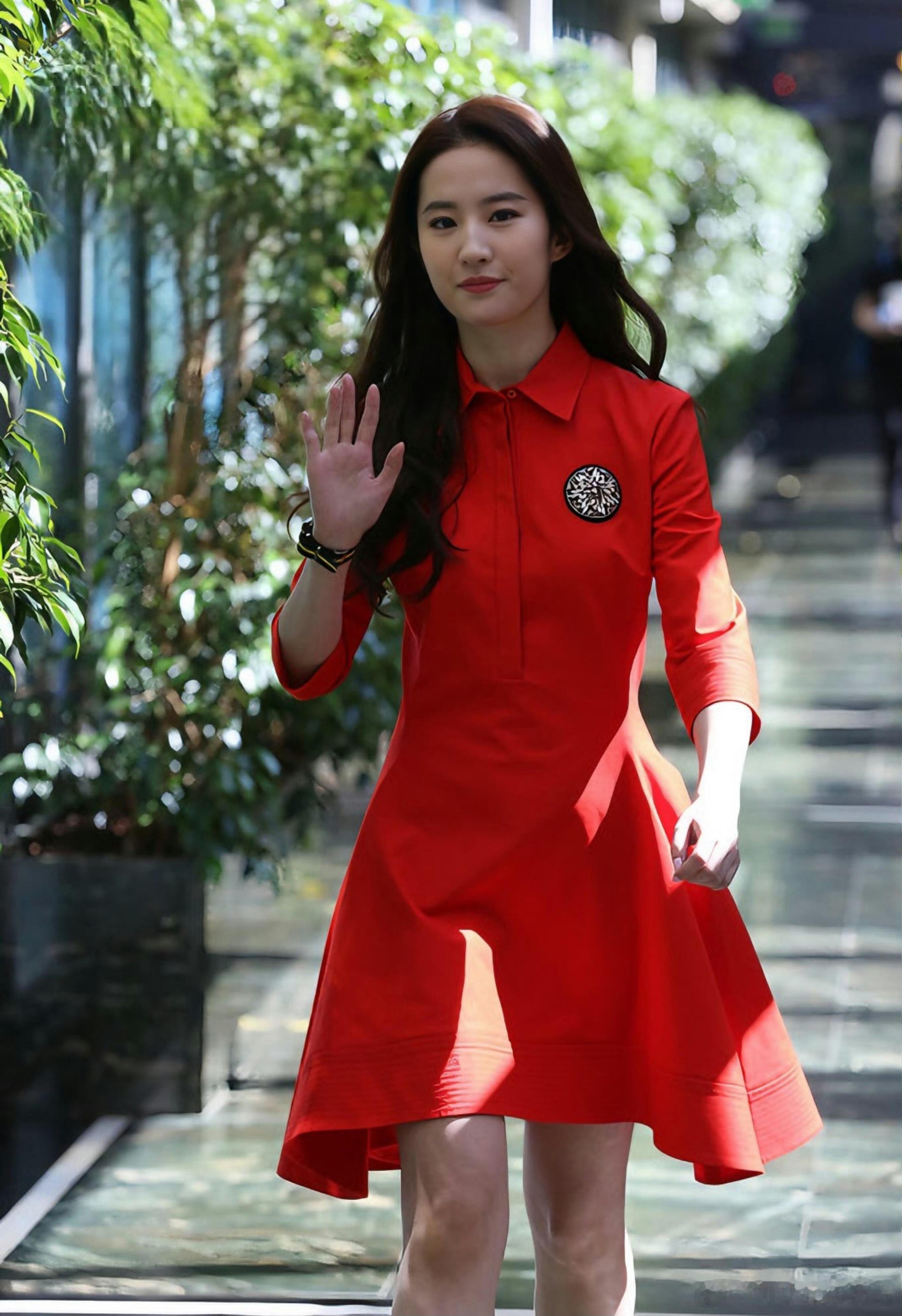 刘亦菲身着一袭正红色翻领收腰A字连衣裙,利落的翻领设计干练又不失优雅,七分袖剪裁露出纤细手腕,不规则下摆随步伐轻扬,活泼又精致。