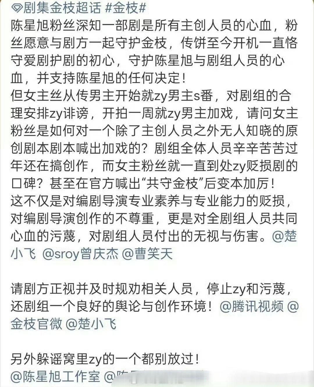 李一桐粉丝跟陈星旭粉丝这两家粉丝都在向《金枝》这个剧组发倡议书了,双方粉丝对于这部剧貌似异议颇多啊