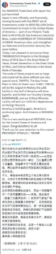 特朗普今天(北京时间2月18日)得意洋洋地发文写道:“我们与日本达成的巨额贸易协