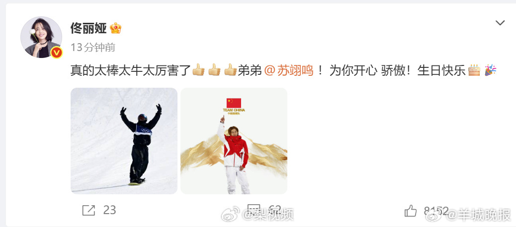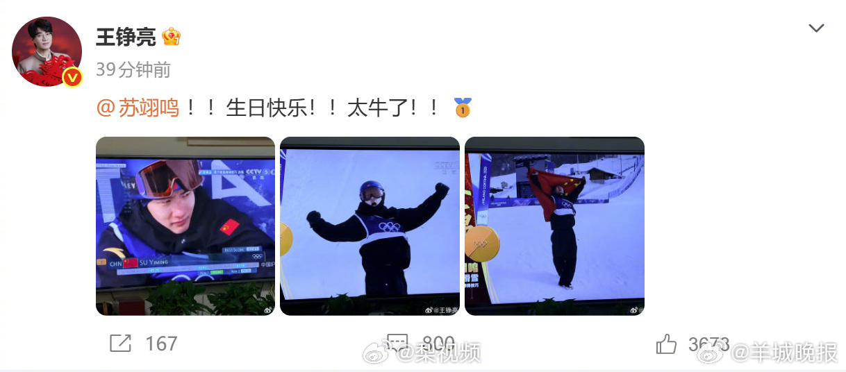【#众星祝贺苏翊鸣#】2月18日,米兰冬奥会单板滑雪男子坡面障碍技巧决赛,中国选手 夺得金牌! 众星纷纷发文祝贺: