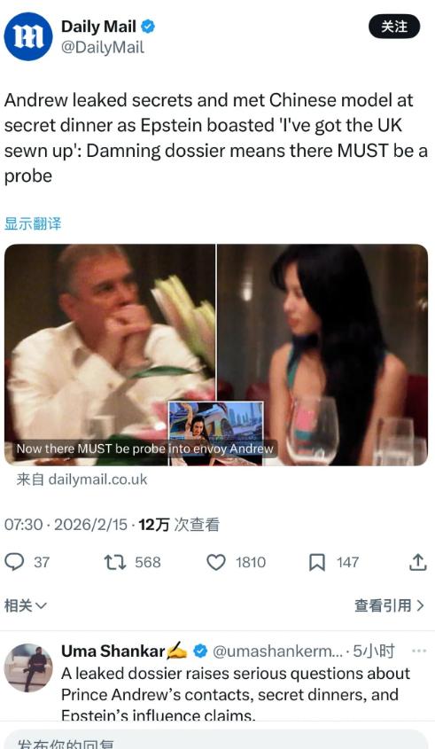 据英国《每日邮报》2月15日报道称,英国王室安德鲁王子泄露秘密,说他与爱泼斯坦在一次秘密晚宴上结识了一名中国模特。 当时爱泼斯坦还吹嘘道:“我已经掌控了英国。”如此一来,安德鲁王子的接触情况再次引发关注,特别爱泼斯坦所言“我已掌控英国”,到底事实如何?另外,那一名中国模特同样令人感兴趣。大家怎么看,一起评论区唠唠! 这看着像八卦,其实是给一桩老掉牙的丑闻,又补上了一块要命的新拼图。 为啥说是“泄密”?因为这句话,直接把他以前那套说辞给掀翻了,过去他一直装无辜:和爱泼斯坦不熟、没啥特别来往,现在倒好,承认自己进过对方一手操办的高规格封闭晚宴,还在那里认识新的人物。 这等于亲口证实两件事:这种只圈定少数权贵的秘密局确实存在,他也在里头;而且他不是“路过”,而是圈内人,遮了这么久的场景,被他自己一句话捅了个窟窿。 把这句话放回时间轴里看,更刺激,2008年,爱泼斯坦因性犯罪被定罪;按正常逻辑,谁都该保持距离。 可之后几年,两人仍频繁见面、出入彼此住所,一起飞来飞去,约在2010年前后,安德鲁还在当英国贸易特使,却被爆出把涉及阿富汗金矿、铀矿、亚洲国家简报等敏感信息发给爱泼斯坦,再往后,是丑闻扩散,他被舆论围攻,被王室收回头衔、赶出住所。 现在再加上这场“秘密晚宴+中国模特”,还能说只是“点头之交”吗?这已经是长期勾连的一环,而不是一次偶遇。 那这名中国模特为什么被盯得这么紧?先说清楚现实边界:公开信息不多,有的报道点名,有的只写“中国模特”,目前没有证据显示她违法,更不能乱扣帽子。 但她之所以被反复提起,是因为她正好踩在爱泼斯坦那套经典玩法上——用模特、名流、美貌当“社交纽带”,把不同国家的政商圈拧成一团。 对咱们读者来说,这把原本主要集中在欧美的权力网,瞬间拉成一张跨国网,她在舆论里,更像是一个隐秘节点,而不是八卦里的“路人甲”。 再想想那句嚣张的“我已经掌控了英国”,爱泼斯坦靠掌控的,从来不是职位,而是人的把柄:王室成员的私生活,前驻美大使的金钱往来,政客嘴里吐出的内部消息。 而秘密晚宴就是这套操作的载体之一:一边是王子、机密、象征权威,一边是资本、关系、信息流,中间夹着模特、艺人当筹码,人情、交易、秘密一桌解决,所谓“掌控”,说白了,就是把一批关键人物捆在自己的网里,让他们离不开你。 这次“说漏嘴”,对安德鲁来说,绝对不只是出个丑那么简单。 他本来已经被剥夺头衔、赶出住所,现在又主动把自己和爱泼斯坦、秘密晚宴、中国模特绑在同一句话里,等于邀请媒体和调查机构再把灯光打回来,他到底参加过多少类似聚会?掌握多少内情?会不会引出进一步的泄密、滥用职权调查,都很难再压下去。 对英国王室,这又是一记重锤,哈里夫妇出走、查尔斯口碑争议,已经把这家老牌王室的光环磨得差不多了,现在安德鲁又不断往爱泼斯坦这口烂井里跳,对很多年轻人来说,这不再是“个别王子不争气”,而是整个制度的可信度在往下掉。 一个靠形象和传统吃饭的机构,一旦给人留下“上层乱成这样”的印象,要翻身就很难了。 对整起爱泼斯坦案,这句看似随口的“秘密晚宴认识中国模特”,很可能是后面更多曝光的起点,别忘了,还有三百多万页档案在陆续解封,邮件、转账、名单、照片,哪一页被翻出来,可能就是一个新炸点。 而这句话的意义不在“八卦劲儿”,更在于它再次证明,那张权钱、权色交织的网还在往外露线头,而且牵到的,不只是一个美国富豪,而是一整片自以为站在金字塔顶端的人。 对此,大家有什么想说的呢?欢迎在评论区踊跃留言!麻烦看官老爷们阅读后点赞关注,谢谢! (个人观点,理性观看)