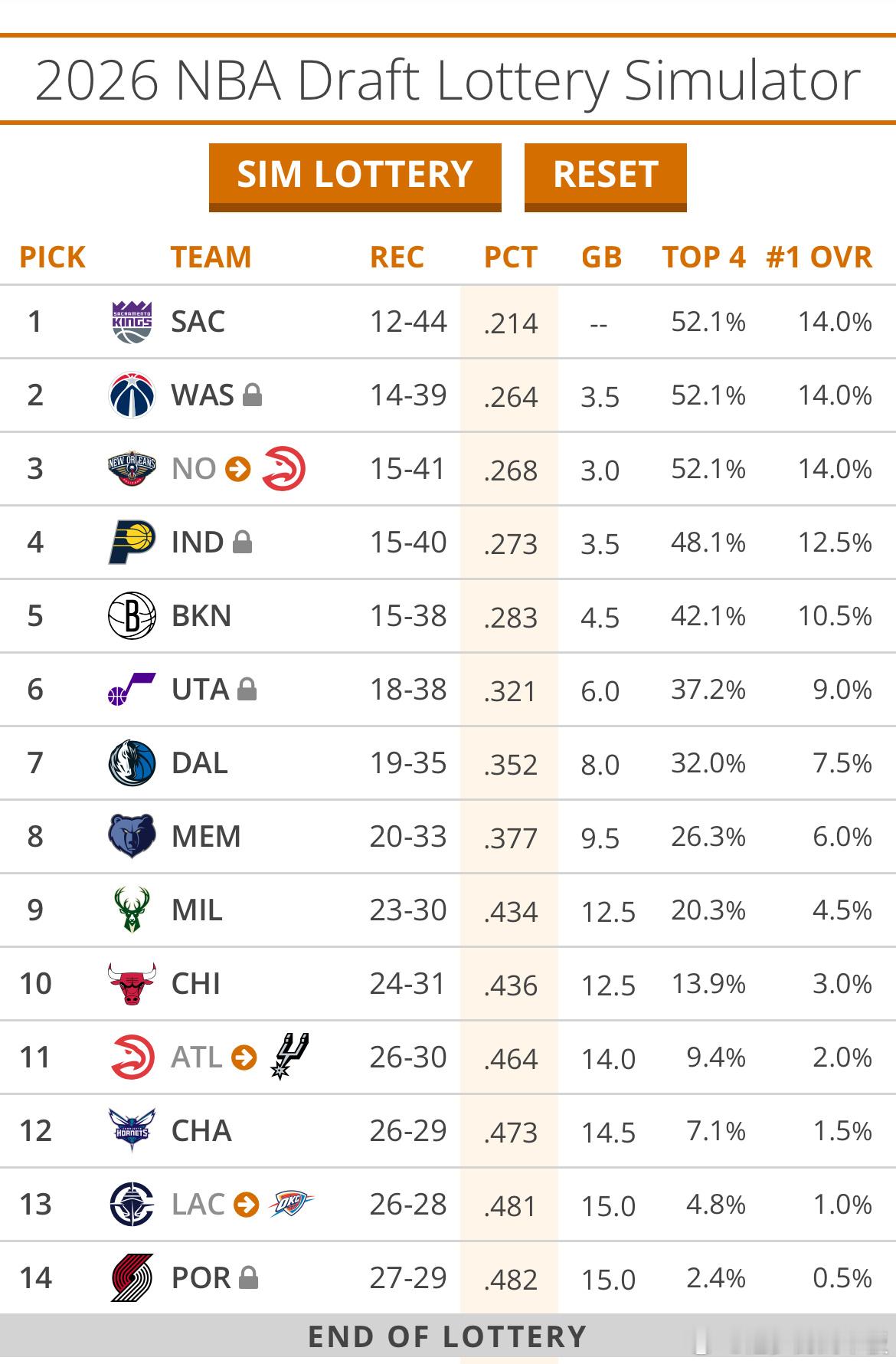 2026选秀权当前情况:国王、奇才、老鹰拥有最高的状元签概率。