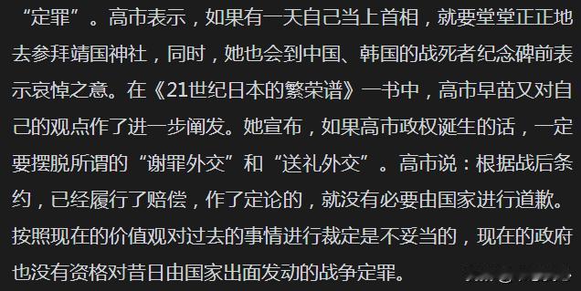 1995年,日本国会讨论“不战决议”时,高市表态说这是父辈的事情,与她这一代人没有关系,并投了反对票。 这就是高市早苗对于战争的态度,而且也不会对日本在二战中的滔天罪行反思。因为,日本人会“选择性记忆”和“选择性遗忘”,而高市早苗是其中的佼佼者! 另外,高市早苗之前就表示过,如果有一天自己当上首相,就要堂堂正正地去参拜靖国神社!2007年,高市早苗就成为了安倍晋三内阁首位参拜靖国神社阁员! 如今,高市早苗成为日本的第104任、105任首相。她的参拜靖国神社,估计是迟早的事情了。 虽然我们不喜欢高市早苗,但是,她在成为第104任首相后,再次当上第105任首相,说明了日本右翼分子在日本的势力不小,日本军国主义抬头,而在亚太地区上空,战争的阴云在持续酝酿中……高市早苗 书慰我心说国际时政 中日关系 资料:《近代以来日本的中国观 第六卷(1972-2010)》