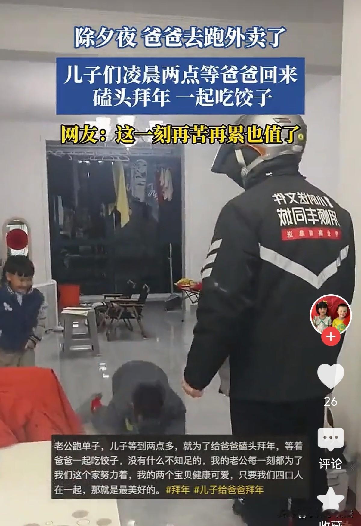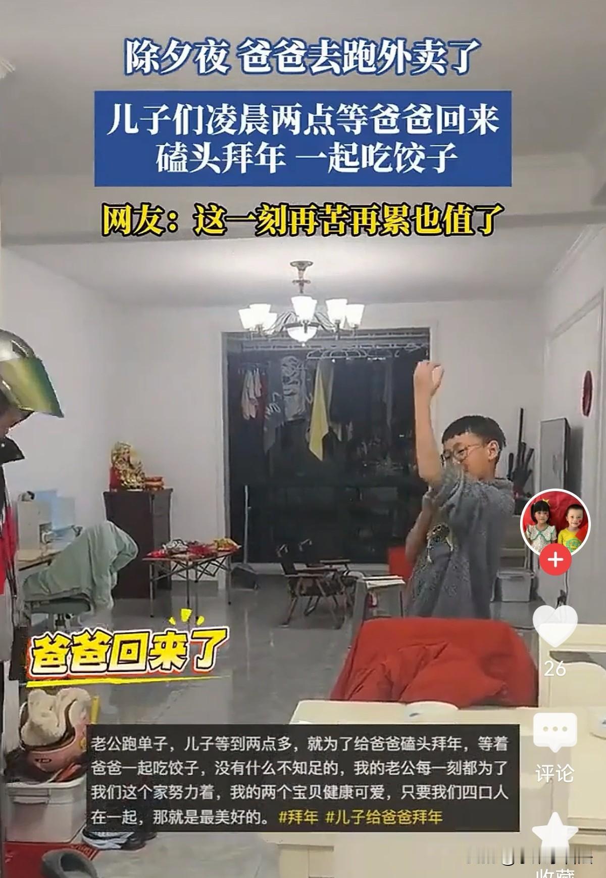感动哭了!安徽,一男子是外卖员,除夕夜吃过年饭后,他选择继续出去跑外卖,没在家陪妻儿在家过年。凌晨2点到家,刚打开门,2个儿子就跑过来给他磕头拜年,而妻子也赶忙去厨房给他下饺子。他没想妻儿会等他到凌晨,他乐的合不拢嘴!网友:这一刻再苦再累也值了! 除夕夜,本该是一家人围坐在一起吃年夜饭、看春晚、守岁迎新的时刻,可刘先生小哥却匆匆吃完年饭,告别妻儿,一头扎进了寒冷的夜色里继续送外卖! 他不是不想团圆,而是肩上扛着一个家的重量,只能趁着除夕夜运力紧张、单价更高,多跑几单,多挣一点,让妻儿的日子能过得更踏实一点。 刘先生和妻子是自由恋爱,婚后两个人的日子轻松又自在,没有太多压力,想逛街就逛街,想休息就休息。 可自从两个儿子相继出生,生活一下子就变了模样。妻子为了照顾孩子,安心做起了全职妈妈,家里所有的经济压力,全都压在了刘先生一个人的肩上。 为了撑起这个家,他试过不少工作,最后选择了时间相对自由、多劳多得的外卖员。 别人觉得风吹日晒很辛苦,可刘先生知道,只要肯跑、肯拼,就能给孩子买奶粉、交学费,就能让妻子不用为柴米油盐发愁。 今年除夕,家家户户都沉浸在团圆的喜悦里,店铺早早关门,大街上冷冷清清。 可越是这样,外卖订单的价格就越高,刘先生心里很清楚,这是多挣钱的好机会。 他匆匆和家人吃完年夜饭,没敢多停留,换上工作服,骑着电动车就出门了。 夜色越来越深,寒风刮在脸上有些刺骨,别人都在温暖的家里守岁,刘先生却在空旷的马路上奔波。 一想到家里的妻儿,他就浑身是劲,再冷、再累也咬牙坚持。 一单接一单地跑,等他停下看时间时,已经是凌晨一点多,街上几乎没有单子了,他这才拖着疲惫的身体往家赶。 到家时已凌晨2点,小区里静悄悄的,家家户户的灯都熄了。 刘先生心里既心酸又愧疚,他也想陪着妻子孩子过年,也想看着孩子守岁、听他们说新年快乐,可生活不允许他停下来。 他掏出钥匙,楼道里黑漆漆的,摸索了半天都没对准锁孔,那一刻,他只觉得浑身累得快要散架。 可就在他推开门的一瞬间,原本漆黑的屋子突然亮了起来。 还没等他反应过来,两个小小的身影就朝着他飞奔而来,一边跑一边大声喊着“爸爸回来了”。 紧接着,两个孩子齐刷刷地跪在地上,仰着通红的小脸,奶声奶气地说:“爸爸,新年快乐!” 这一幕,让累了一整晚的刘先生瞬间僵在原地,心里又酸又暖,眼泪差点直接掉下来。 他赶紧弯腰,把两个懂事的儿子一个个扶起来,紧紧抱在怀里。孩子没有抱怨他除夕夜不在家,反而一直守到凌晨,就为了等他回来,给他磕个头、拜个年。 还没等他平复心情,妻子也从房间里走出来,温柔地让他先陪孩子说说话,自己转身就进了厨房。 没过几分钟,一碗热气腾腾的饺子就端到了他面前。 深夜、寒风、奔波、疲惫,在看到妻儿的那一刻,全都烟消云散。刘先生捧着那碗滚烫的饺子,看着眼前懂事的孩子、体贴的妻子,再也忍不住眼眶发热。 他怕家人看见,赶紧低下头,大口大口地吃着饺子,每一口都暖到了心里。 妻子在一旁轻声叮嘱:“慢点吃,别烫着。”简单一句话,却胜过千言万语。 这件事被分享到网上后,无数网友被狠狠破防。 有人说,成年人的世界哪有容易二字,他不是不想过年,他是在为家拼命。 也有人说,这才是最真实的年味儿,不是山珍海味,不是热闹鞭炮,而是有人等你回家、有人懂你辛苦、有人把你放在心尖上。 对刘先生来说,这一晚跑再多的单、受再多的累,都比不上开门那一刻的温暖。 两个孩子的跪拜,一碗深夜的饺子,就是他奋斗路上最硬的底气,也是这个新年里,最珍贵、最泪目的团圆。 您怎样理解家与幸福?