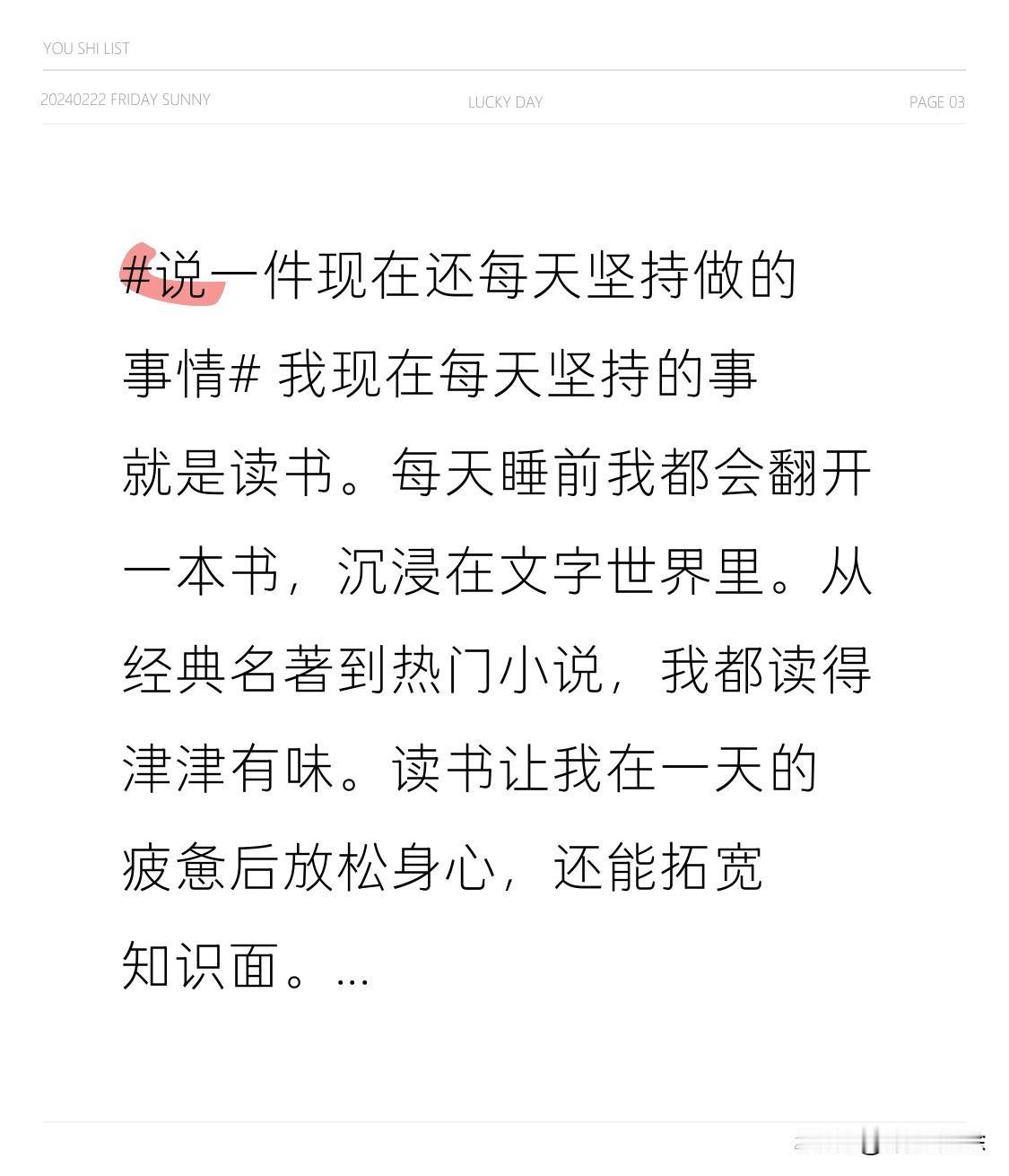 我现在每天坚持的事就是读书。每天睡前我都会翻开一本书,沉浸在文字世界里。从经典名著到热门小说,我都读得津津有味。读书让我在一天的疲惫后放松身心,还能拓宽知识面。就像昨天读的历史书,让我了解到古代有趣的风俗。这小小的习惯,成了我生活中不可或缺的一部分。