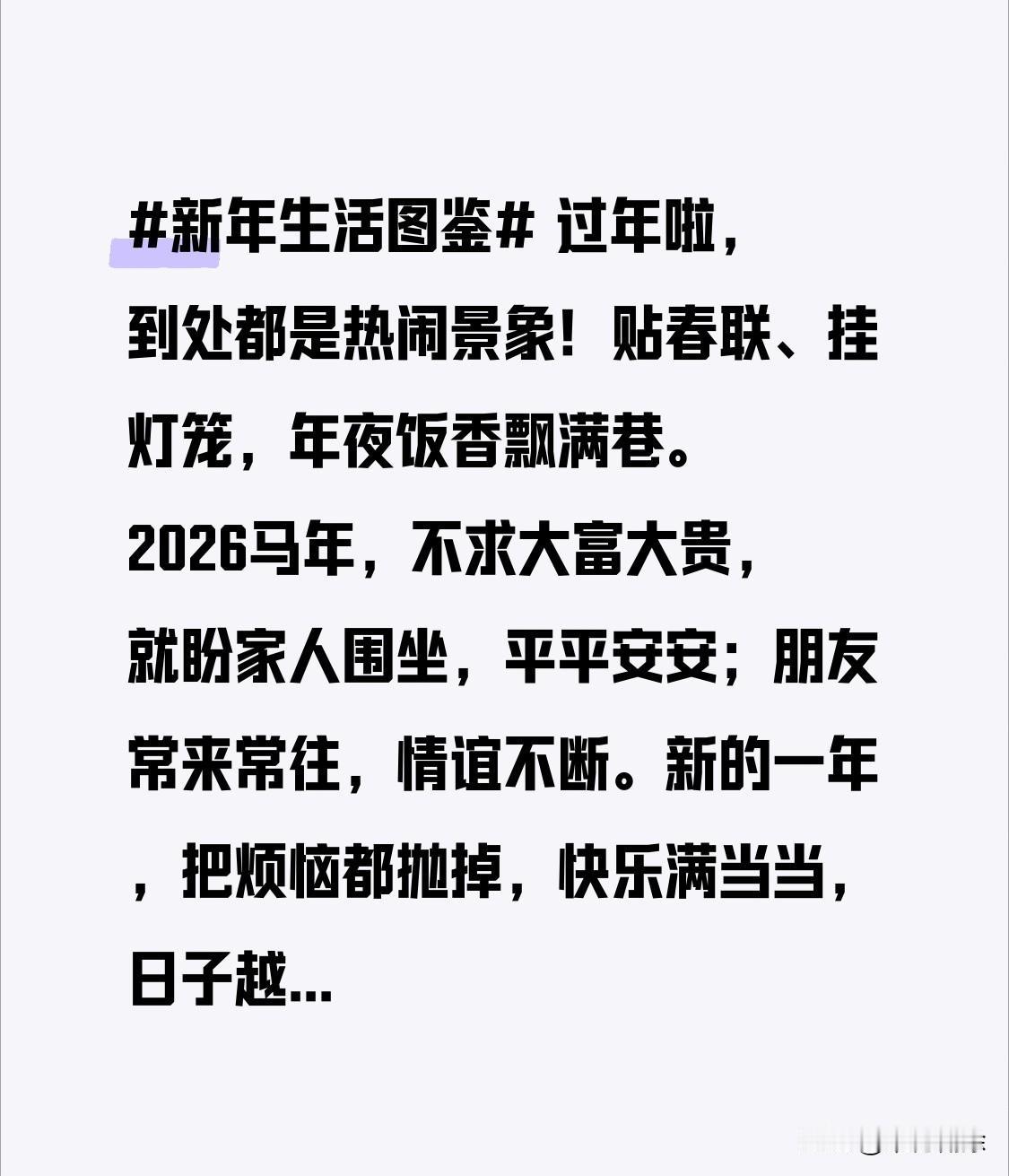 过年啦,到处都是热闹景象!贴春联、挂灯笼,年夜饭香飘满巷。2026马年,不求大富大贵,就盼家人围坐,平平安安;朋友常来常往,情谊不断。新的一年,把烦恼都抛掉,快乐满当当,日子越过越有盼头,新春快乐哟!
