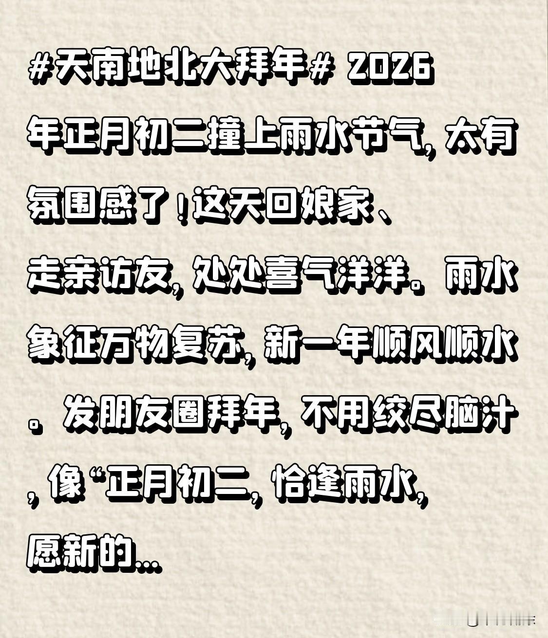2026年正月初二撞上雨水节气,太有氛围感了!这天回娘家、走亲访友,处处喜气洋洋。雨水象征万物复苏,新一年顺风顺水。 发朋友圈拜年,不用绞尽脑汁,像“正月初二,恰逢雨水,愿新的一年,平安顺遂,万事心安”就超合适。简单大气又接地气,直接复制用,让祝福更有温度!