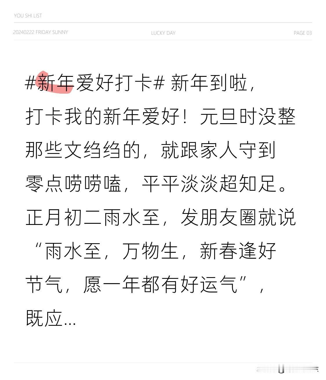 新年到啦,打卡我的新年爱好!元旦时没整那些文绉绉的,就跟家人守到零点唠唠嗑,平平淡淡超知足。正月初二雨水至,发朋友圈就说“雨水至,万物生,新春逢好节气,愿一年都有好运气”,既应景又接地气。新的一年,我打算少点外卖多做饭,从日常小确幸开启新征程!