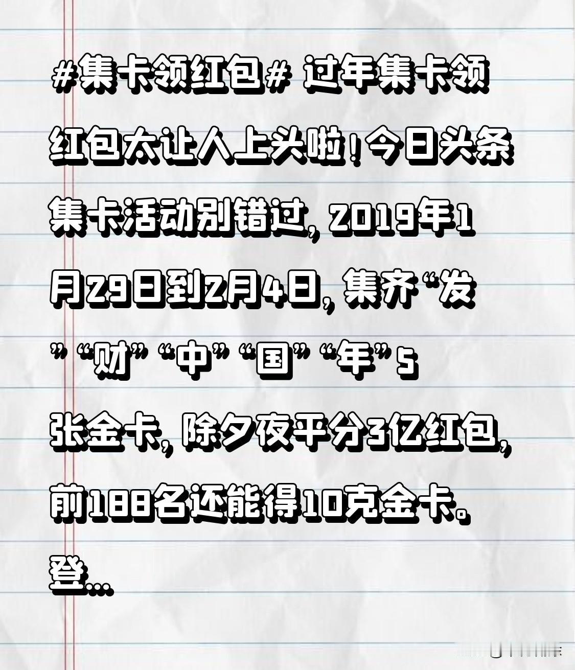 过年集卡领红包太让人上头啦!今日头条集卡活动别错过,2019年1月29日到2月4日,集齐“发”“财”“中”“国”“年”5张金卡,除夕夜平分3亿红包,前188名还能得10克金卡。登录用户每天可领3张金卡,分享还能多抽。还有5亿红包雨,10场连玩,手快有手慢无!赶紧集起来,说不定暴富的就是你!