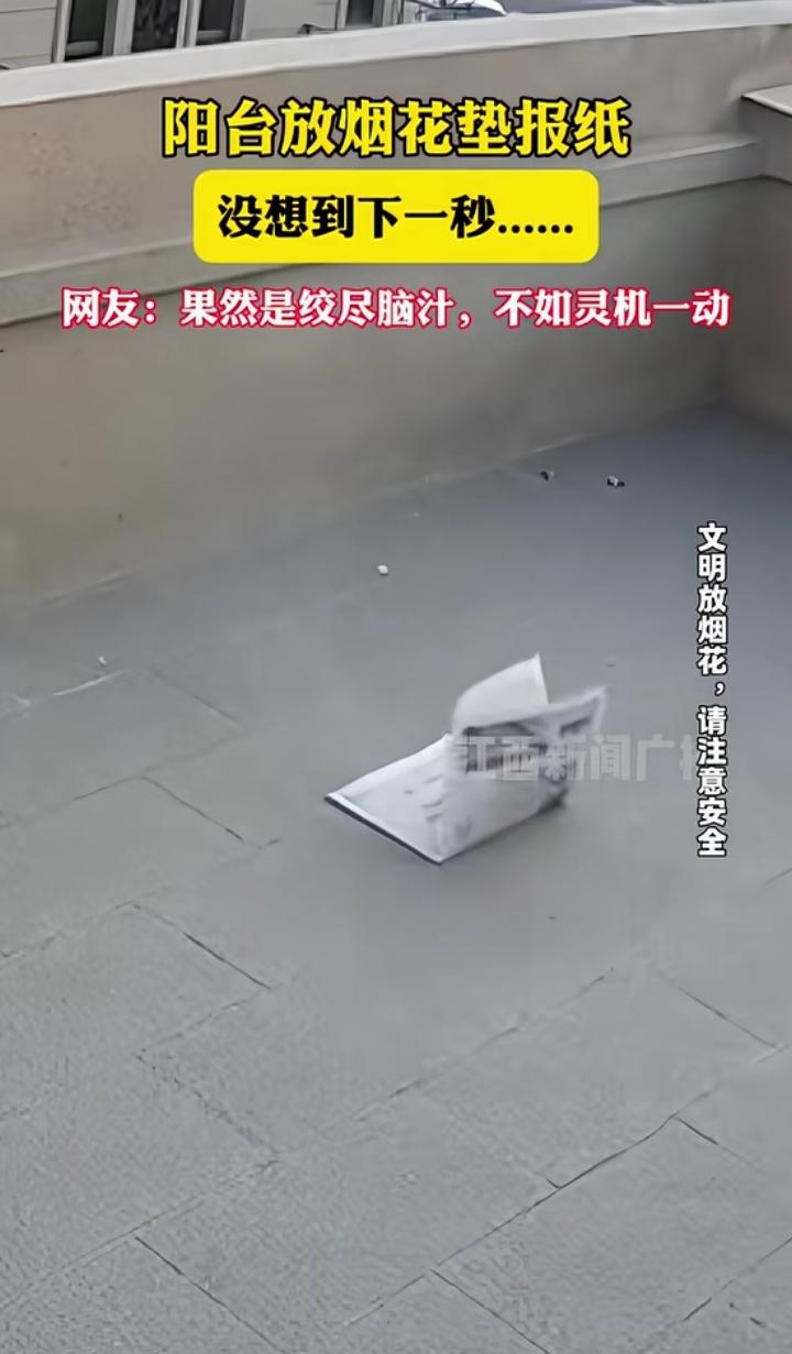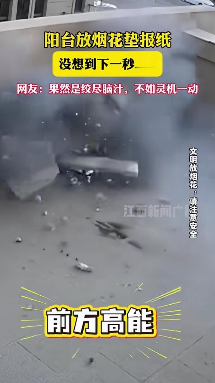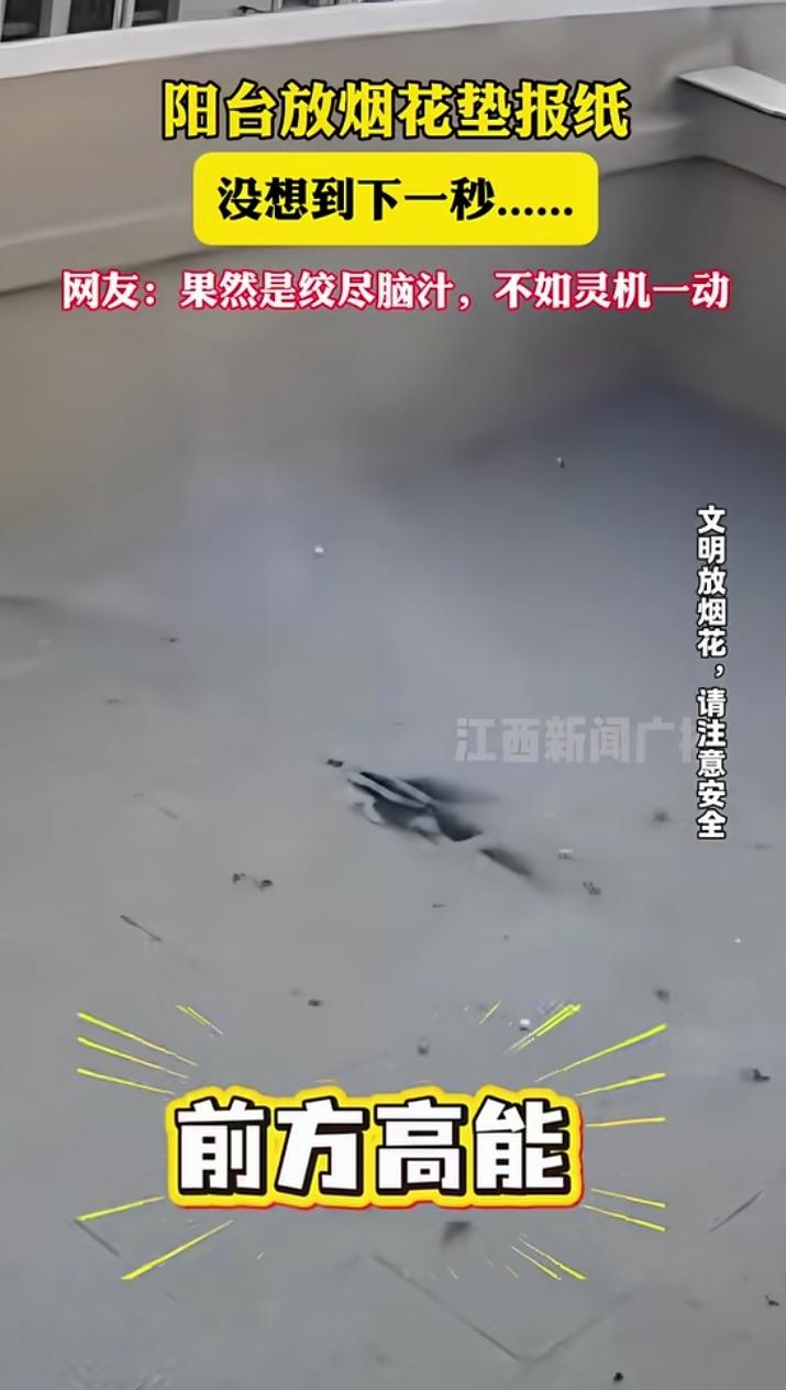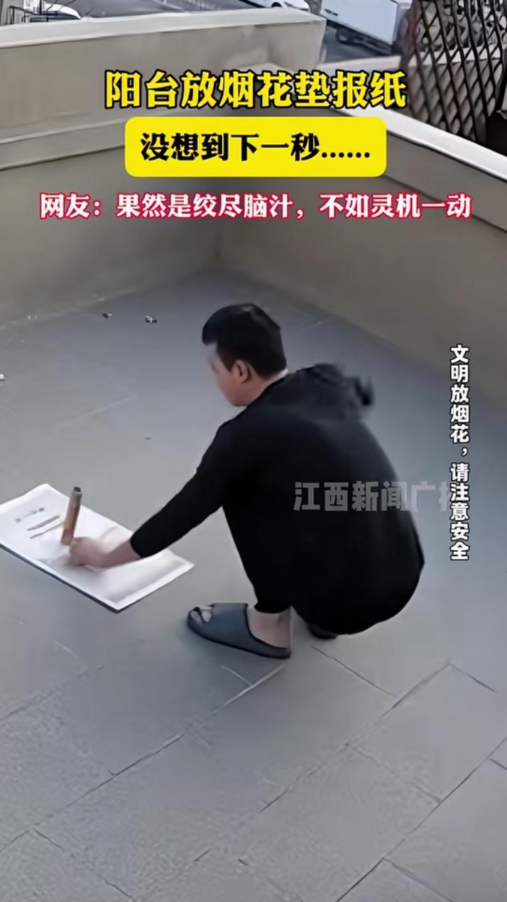男子阳台放烟花垫报纸,下一秒笑不活了! 为了保护阳台地砖,这位大哥灵机一动,在烟花下面垫了张报纸。 结果风一吹,报纸“起飞”跘倒烟花,烟花向着护栏飞去,威力惊人把护栏炸开了。 网友笑评:“绞尽脑汁想保护地砖,结果把护栏炸了,得不偿失!” 温馨提示:燃放烟花爆竹一定要远离易燃物,选择开阔安全的场地,别让“仪式感”变成“社死现场”哦~😂 放烟花规范 放烟花爆炸