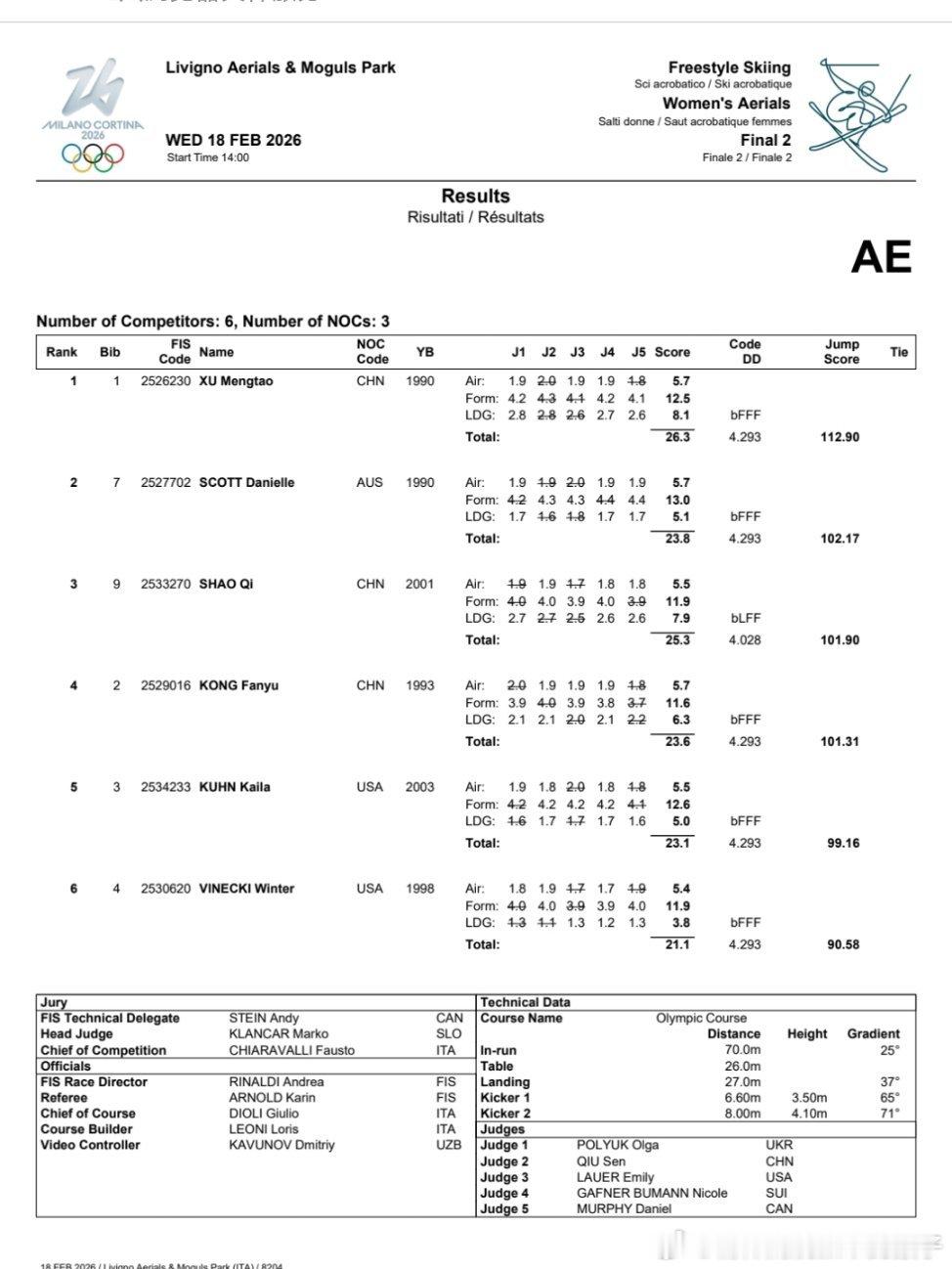 自由式滑雪女子空中技巧决赛孔凡钰 可惜 亚军的裁判打分我有点看不懂。。。。。😅落地都坐地上了其实感觉我们有机会三面五星红旗的,孔凡钰好可惜